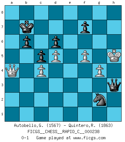 Last move : 0-1 2020 October 23 8:11:52 [Event "FICGS__CHESS__RAPID_C__000238"] [Site "FICGS"] [Date "2020.06.09"] [Round "1"] [White "Autobello,Giovanni"] [Black "Quintero,Raul"] [Result "0-1"] [WhiteElo "1567"] [BlackElo "1863"] 1.d4 Nf6 2.c4 e6 3.Nf3 Bb4+ 4.Bd2 a5 5.Nc3 O-O 6.g3 b6 7.Bg2 Bb7 8.O-O d6 9.a3 Bxc3 10.bxc3 Nbd7 11.Bg5 h6 12.Bxf6 Nxf6 13.e3 Qc8 14.a4 c5 15.Qb3 Qc7 16.Rab1 Nd7 17.Rfe1 Rab8 18.e4 Ba6 19.d5 exd5 20.exd5 Rfe8 21.Bh3 Rxe1+ 22.Rxe1 Nf6 23.Nh4 Bc8 24.Bxc8 Rxc8 25.Qb5 g6 26.f4 Kf8 27.Kg2 Re8 28.Rxe8+ Nxe8 29.Kf3 Ke7 30.g4 Ng7 31.h3 Kd8 32.Qb1 Kc8 33.Qe4 Qd7 34.f5 g5 35.Ng2 Qxa4 36.Qe7 Qd7 37.Qf8+ Ne8 38.Qxh6 a4 39.Qxg5 a3 40.Qd2 Qa4 41.Qa2 Qd1+ 42.Ke3 Qc1+ 43.Kd3 Qd1+ 44.Ke3 Qc1+ 45.Kd3 Nf6 46.Ne3 Nd7 47.Qc2 Ne5+ 48.Ke2 Qh1 49.Qa4 Kb7 50.Qxa3 Qf3+ 51.Kd2 Qf2+ 52.Kd1 Qxe3 53.Qa4 Qd3+ 54.Ke1 Qxc3+ 55.Kf2 Qd4+ 56.Kg3 Qe3+ 57.Kh4 Nf3+ 58.Kg3 Ne1 59.Kh4 Ng2+ 60.Kh5 Qxh3+ 0-1 Bogo-Indian defense Kingside Castling by player Black (move 5) Kingside Castling by player White (move 8) Player Black won this chess game. Follow this game move after move (download)Chess is the art which expresses the science of logic. (Mikhail Botvinnik) Korrekt heißt in Deutschland die Haltung eines Mannes, dessen Benehmen nach dem Urteile seiner Nachbarn seiner Stellung angemessen ist. Um korrekt zu sein, muß man sich der Meinung der anderen anpassen... (Emanuel Lasker) A través de las casillas del tablero, los Indios explican el movimiento del tiempo y la edad, las influencias mas altas que controlan el mundo y los lazos que vinculan al Ajedrez con el alma humana. (Al-Masudi) L'action d'une oeuvre littéraire se déroule sur un champ de bataille. Les masques et les types du drame moderne correspondent aux pièces du jeu d'échecs. L'intrigue correspond aux coups et aux gambits, c'est à dire aux techniques du jeu telles qu'utilisées et interprétées par les joueurs. Les tactiques et les péripéties [mouvements] correspondent aux coups exécutés par l'adversaire. (Viktor Shklovsky) An expert is a man who has made all the mistakes which can be made in a very narrow field. (Niels Bohr)