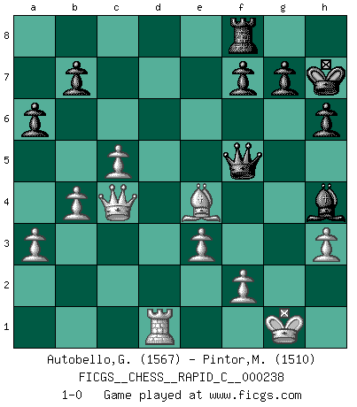 Last move : 1-0 2020 August 10 2:28:49 [Event "FICGS__CHESS__RAPID_C__000238"] [Site "FICGS"] [Date "2020.06.09"] [Round "1"] [White "Autobello,Giovanni"] [Black "Pintor,Manuel"] [Result "1-0"] [WhiteElo "1567"] [BlackElo "1510"] 1.c4 e5 2.Nc3 Bc5 3.Nf3 Nc6 4.g3 d6 5.Bg2 Nf6 6.d3 O-O 7.O-O Bg4 8.Bg5 h6 9.Bxf6 Qxf6 10.Nd5 Qd8 11.a3 Nd4 12.Nxd4 Bxd4 13.Rb1 c6 14.Nc3 Qg5 15.Ne4 Qg6 16.b4 a6 17.h3 Bf5 18.Qc2 Bxe4 19.Bxe4 Qxg3+ 20.Bg2 Qg6 21.c5 e4 22.dxe4 d5 23.Qd3 Qf6 24.exd5 cxd5 25.Bxd5 Rad8 26.Qb3 Qg5+ 27.Bg2 Kh7 28.e3 Bf6 29.Rbd1 Qf5 30.Qc4 Rxd1 31.Rxd1 Bh4 32.Be4 1-0 English Opening Kingside Castling by player Black (move 6) Kingside Castling by player White (move 7) Player White won this chess game. Follow this game move after move (download)I like to say that Bobby Fischer was the greatest player ever. But what made Fischer a genius was his ability to blend an American freshness and pragmatism with Russian ideas about strategy. (Bruce Pandolfini) Obwohl ich vom Stil her kaum zu den Priestern der Schachkunst gezählt werde, halte ich Schach doch für eine Kunst. (Tigran Petrosjan) Un buen jugador siempre tiene buena suerte. (José Raúl Capablanca) Le système Elo représente seulement une moyenne. Il est simplement un indicateur de votre stabilité. (Anatoli Karpov) Nothing is more important for teaching us to understand the concepts we have than constructing fictitious ones. (Ludwig Wittgenstein)