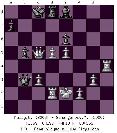 Last move : 1-0 2020 July 30 17:19:39 [Event "FICGS__CHESS__RAPID_A__000255"] [Site "FICGS"] [Date "2020.06.09"] [Round "1"] [White "Kuliy,Oleksandr"] [Black "Schangareev,Mirzian"] [Result "1-0"] [WhiteElo "2003"] [BlackElo "2000"] 1.d4 d5 2.c4 c6 3.Nc3 e6 4.Nf3 Nf6 5.Bg5 dxc4 6.e4 b5 7.e5 h6 8.Bh4 g5 9.Nxg5 hxg5 10.Bxg5 Nbd7 11.g3 Rg8 12.h4 Rxg5 13.hxg5 Nd5 14.g6 fxg6 15.Qg4 Qe7 16.Bg2 Qf7 17.Be4 Kd8 18.Bxg6 Qe7 19.Rh7 Qb4 20.Rd1 N7b6 21.Qf3 Be7 22.Rd2 Rb8 23.Qf7 Bd7 24.a3 Qb3 25.Nxd5 Nxd5 26.Be4 c3 27.bxc3 Kc7 28.Bxd5 Qxd5 29.Qxe7 Re8 30.Qf7 Qe4+ 31.Kf1 Rd8 32.Qe7 Kc8 33.Rh4 Qf3 34.Qc5 Kb8 35.a4 Qf8 36.axb5 cxb5 37.Rh7 Qf5 38.Qd6+ Kc8 39.Rh4 Qb1+ 40.Ke2 Qb3 41.d5 Be8 42.Qc5+ 1-0 QGD Slav defense Player White won this chess game. Follow this game move after move (download)The winner of the game is the player who makes the next-to-last mistake. (Savielly Tartakover) Konzentriere dich auf materielle Gewinne. Nimm, was dir dein Gegner gibt, ausser es gibt einen guten Grund der dagegenspricht. (Robert James Fischer) Existen dos clases de sacrificios: los correctos y los míos. (Mikhail Tal) Votre prénom est 'Tactique', votre deuxième prénom est 'Tactique' et votre nom est 'Tactique'. (Ken Smith) The message for business people contemplating their place in the cyberspace is simple and direct: get linked or get lost. (Vic Sussman and Kenan Pollack)