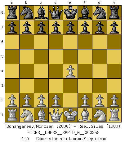 Last move : 1-0 2020 July 11 13:4:13 [Event "FICGS__CHESS__RAPID_A__000255"] [Site "FICGS"] [Date "2020.06.09"] [Round "1"] [White "Schangareev,Mirzian"] [Black "Reel,Silas"] [Result "1-0"] [WhiteElo "2000"] [BlackElo "1900"] 1.e4 1-0 This chess game has been lost on time (started : 2020.06.09 1:15:4) King's pawn Opening Player White won this chess game. Follow this game move after move (download)Chess is war over the board. The object is to crush the opponents mind. (Bobby Fischer) Der vorletzte Fehler gewinnt. (Savielly Grigorievitsch Tartakower) Debemos de asegurarnos de que el Ajedrez no se convierta en un lenguaje muerto, muy interesante, pero solo para un grupo muy pequeño. (Sytze Faber) A ce moment-là, je menaçais de comprendre la position ! (Clément L'Heureux) Dave, my mind is going. I can feel it. (HAL 9000 in 2001, a space odyssey)