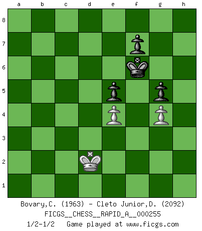 Last move : 1/2-1/2 2020 August 18 12:23:12 [Event "FICGS__CHESS__RAPID_A__000255"] [Site "FICGS"] [Date "2020.06.09"] [Round "1"] [White "Bovary,Charles"] [Black "Cleto Junior,Dirceu"] [Result "1/2-1/2"] [WhiteElo "1963"] [BlackElo "2092"] 1.e4 c5 2.Nf3 d6 3.d4 cxd4 4.Nxd4 Nf6 5.Nc3 a6 6.Rg1 b5 7.g4 Bb7 8.Bg2 g6 9.Bg5 e5 10.Nb3 Nbd7 11.a3 Rc8 12.Qe2 Nb6 13.O-O-O Rxc3 14.bxc3 h6 15.Bxf6 Qxf6 16.Na5 Qe7 17.c4 d5 18.c5 Qxc5 19.Rd3 d4 20.Nxb7 Qc7 21.Na5 Na4 22.Nb3 Bxa3+ 23.Kd1 a5 24.Nc1 b4 25.Qd2 Bb2 26.f4 Nb6 27.f5 Nc4 28.Qe2 g5 29.h4 O-O 30.Na2 Qb6 31.Ke1 a4 32.Kf2 b3 33.cxb3 axb3 34.Nc1 Bc3 35.Nxb3 Qxb3 36.hxg5 Nb2 37.Rgd1 hxg5 38.Bf1 Nxd1+ 39.Qxd1 Qb2+ 40.Qe2 Rb8 41.Qxb2 Rxb2+ 42.Be2 Kf8 43.Rh3 Ke7 44.Kf1 Kd6 45.f6 Rb1+ 46.Kf2 Rc1 47.Rf3 Be1+ 48.Kg2 Ke6 49.Rf1 Rc2 50.Rxe1 d3 51.Kf3 dxe2 52.Rxe2 Rxe2 53.Kxe2 Kxf6 54.Kd2 1/2-1/2 Sicilian : Najdorf Queenside Castling by player White (move 13) Kingside Castling by player Black (move 29) 10 pieces endgame at move 52 : White KRPPP , Black KRPPP WHITE : King + 1 Rook 3 Pawns BLACK : King + 1 Rook 3 Pawns 9 pieces endgame at move 52 : White KPPP , Black KRPPP WHITE : King + 3 Pawns BLACK : King + 1 Rook 3 Pawns 8 pieces endgame at move 53 : White KPPP , Black KPPP WHITE : King + 3 Pawns BLACK : King + 3 Pawns 7 pieces endgame at move 53 : White KPP , Black KPPP WHITE : King + 2 Pawns BLACK : King + 3 Pawns This chess game ended in a draw. Follow this game move after move (download)A bad day of Chess is better than any good day at work. (Anonymous) Wir irren allesamt, nur jeder irrt anders. (Georg Christoph Lichtenberg) Hay jugadores fuertes y personas amables y yo soy un jugador fuerte. (Bobby Fischer) La guerre est enfant de la passion, la passion est enfant du narcissisme et le narcissisme est l'enfant. (...) Une autre partie ? (Thibault de Vassal) It's unlucky to be superstitious. (Dave Enteles)
