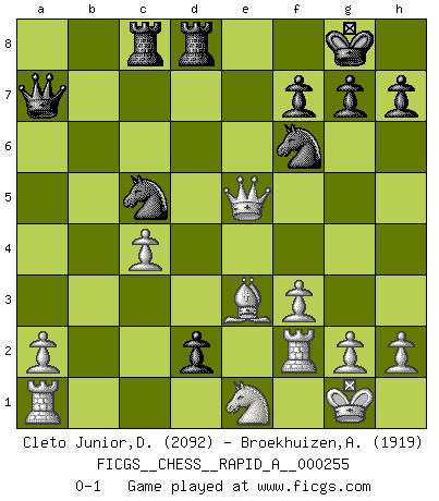 Last move : 0-1 2020 June 29 12:46:56 [Event "FICGS__CHESS__RAPID_A__000255"] [Site "FICGS"] [Date "2020.06.09"] [Round "1"] [White "Cleto Junior,Dirceu"] [Black "Broekhuizen,A. T. S."] [Result "0-1"] [WhiteElo "2092"] [BlackElo "1919"] 1.d4 Nf6 2.c4 e6 3.Nf3 b6 4.Nc3 Bb4 5.e3 Bb7 6.Bd3 O-O 7.O-O Bxc3 8.bxc3 c5 9.Ne1 Re8 10.e4 Nxe4 11.Qc2 d5 12.f3 Nf6 13.dxc5 Nbd7 14.cxb6 Rc8 15.bxa7 dxc4 16.Qb2 cxd3 17.Qxb7 Nc5 18.Qb2 Qa5 19.Be3 Red8 20.c4 Qxa7 21.Rf2 e5 22.Qxe5 d2 0-1 Queen's Indian : 4.Nc3 Kingside Castling by player Black (move 6) Kingside Castling by player White (move 7) Player Black won this chess game. Follow this game move after move (download)Nothing excites jaded Grandmasters more than a theoretical novelty. (Dominic Lawson) Versuche, dich von der Sklaverei der Eröffnungsvarianten zu befreien. Stattdessen soll man gewisse Typenpositionen erlernen, die man eingehend analysiert. (Aaron Nimzowitsch) Sin errores no puede haber brillantez. (Emanuel Lasker) Les réformistes prétendent que les progrès de la théorie conduiront à la disparition des échecs, et qu'il faut, pour leur rendre vie, en remanier les règles. En réalité, qu'exprime cette affirmation? Le mépris de l'intuition, de l'imagination et de tous les autres éléments qui font des échecs un art. (Alexander Alekhine) The Internet is the world's largest library. It's just that all the books are on the floor. (John Allen Paulos)