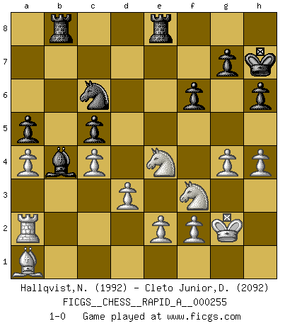 Last move : 1-0 2020 August 8 2:55:47 [Event "FICGS__CHESS__RAPID_A__000255"] [Site "FICGS"] [Date "2020.06.09"] [Round "1"] [White "Hallqvist,Niklas"] [Black "Cleto Junior,Dirceu"] [Result "1-0"] [WhiteElo "1992"] [BlackElo "2092"] 1.c4 Nf6 2.g3 e5 3.Bg2 d5 4.cxd5 Nxd5 5.Nc3 Nb6 6.Nf3 Nc6 7.O-O Be7 8.b3 O-O 9.Bb2 Re8 10.Rc1 Bf5 11.d3 Qd7 12.Ne4 Bh3 13.Bxh3 Qxh3 14.Bxe5 Ba3 15.Rxc6 bxc6 16.Qc2 Qe6 17.Bxc7 h6 18.Be5 a5 19.Rb1 Bf8 20.a4 Nd5 21.Qc4 Rec8 22.Rc1 Re8 23.Bb2 Rac8 24.Kg2 Qd7 25.Ne5 Qf5 26.Nf3 Qd7 27.h3 Kh7 28.Ne5 Qe6 29.Bd4 Ba3 30.Rc2 c5 31.Ba1 f6 32.Nf3 Nb4 33.Rd2 Nc6 34.Ra2 Bb4 35.g4 Qxc4 36.bxc4 Rb8 37.h4 1-0 English, 1...Nf6 (Anglo-Indian defense) Kingside Castling by player White (move 7) Kingside Castling by player Black (move 8) Player White won this chess game. Follow this game move after move (download)Human affairs are like a Chess game: only those who do not take it seriously can be called good players. (Hung Tzu Ch'eng) Kombinieren und Schwarzhandel gehören verboten. (Savielly Grigorievitsch Tartakower) Si tu oponente te ofrece un empate, trata de averiguar porque piensa él que esta en una posición peor. (Nigel Short) Dieu déplace le joueur, et celui-ci la pièce. Quel Dieu derrière Dieu commence donc la trame ? Arturo Perez-Reverte (prix de littérature policière 1993). Two beer, or not two beer. (Unknown)
