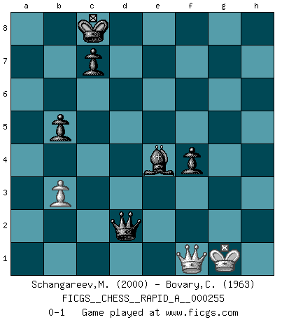 Last move : 0-1 2020 July 9 19:30:35 [Event "FICGS__CHESS__RAPID_A__000255"] [Site "FICGS"] [Date "2020.06.09"] [Round "1"] [White "Schangareev,Mirzian"] [Black "Bovary,Charles"] [Result "0-1"] [WhiteElo "2000"] [BlackElo "1963"] 1.e4 e5 2.Nf3 Nc6 3.Bb5 a6 4.Bxc6 dxc6 5.O-O Qd6 6.b3 Bg4 7.d3 O-O-O 8.Nbd2 f6 9.Nc4 Qe6 10.Rb1 Qe8 11.Be3 h5 12.Qe2 g5 13.Rbd1 c5 14.c3 h4 15.h3 Bh5 16.Rfe1 Qe6 17.Qf1 g4 18.Nxh4 gxh3 19.g3 b5 20.Na5 Bh6 21.Rd2 Bg5 22.Kh2 Bxh4 23.gxh4 Bf3 24.Qxh3 Bg4 25.Qg3 Ne7 26.f3 Ng6 27.Kg1 Bxf3 28.Rh2 Rhg8 29.Kf1 Bg4 30.d4 cxd4 31.cxd4 exd4 32.Nc6 dxe3 33.Nxd8 Rxd8 34.Rxe3 Rd1+ 35.Re1 Qd7 36.Rxd1 Qxd1+ 37.Qe1 Qf3+ 38.Qf2 Qd3+ 39.Kg1 Ne5 40.h5 Qxe4 41.Kf1 Bf5 42.Rh4 Qd3+ 43.Kg2 Qd5+ 44.Kg3 Qg8+ 45.Kh2 Ng4+ 46.Rxg4 Qxg4 47.Qg3 Qxh5+ 48.Kg2 Qe2+ 49.Kg1 Be4 50.a3 f5 51.Qf2 Qd1+ 52.Qf1 Qd2 53.a4 f4 54.axb5 axb5 0-1 Ruy Lopez : Exchange, Bronstein variation Kingside Castling by player White (move 5) Queenside Castling by player Black (move 7) 10 pieces endgame at move 54 : White KQPP , Black KQBPPP WHITE : King + 1 Queen 2 Pawns BLACK : King + 1 Queen 1 Bishop 3 Pawns 9 pieces endgame at move 54 : White KQP , Black KQBPPP WHITE : King + 1 Queen 1 Pawn BLACK : King + 1 Queen 1 Bishop 3 Pawns Player Black won this chess game. Follow this game move after move (download)The enormous mental resilience, without which no Chess player can exist, was so much taken up by Chess that he could never free his mind of this game. (Albert Einstein) Es war undenkbar für die Behörden, dass ein sowjetischer Großmeister auf diese Art und Weise [Fischer-Taimanov 6:0] verliert, ohne dass es eine politischer Erklärung dafür gäbe. (Mark Taimanov) Yo considero que Fischer es uno de los expertos mas grandes de aperturas de siempre. (Keith Hayward) Les Echecs ont trois composantes : le temps, l'espace et le matériel en dernier. (Mikhail Tal) I've never seen so many men wasted so badly. (Blondie in The Good, The Bad and The Ugly)