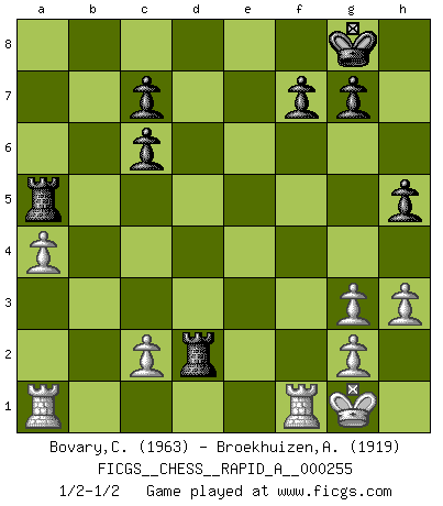 Last move : 1/2-1/2 2020 July 9 8:32:7 [Event "FICGS__CHESS__RAPID_A__000255"] [Site "FICGS"] [Date "2020.06.09"] [Round "1"] [White "Bovary,Charles"] [Black "Broekhuizen,A. T. S."] [Result "1/2-1/2"] [WhiteElo "1963"] [BlackElo "1919"] 1.e4 e5 2.Nf3 Nc6 3.Nc3 Nf6 4.d4 exd4 5.Nxd4 Bb4 6.Nxc6 bxc6 7.Bd3 O-O 8.O-O d5 9.Bd2 Rb8 10.Re1 Ng4 11.h3 Ne5 12.Be2 Be6 13.Be3 Ba5 14.Bxa7 Rxb2 15.Bd4 Ng6 16.Nxd5 Rb8 17.Bc3 Ra8 18.Bxa5 Rxa5 19.Ne3 Qg5 20.Bg4 h5 21.Bf5 Rd8 22.Qf3 Nh4 23.Qg3 Qxg3 24.fxg3 Nxf5 25.exf5 Bxf5 26.Nxf5 Rxf5 27.a4 Rd2 28.Rf1 Ra5 1/2-1/2 Four knights : Scotch, 4...exd4 Kingside Castling by player Black (move 7) Kingside Castling by player White (move 8) This chess game ended in a draw. Follow this game move after move (download)A bad plan is better than none at all. (Frank Marshall) Schach ist wie eine schöne Frau, zu der wir ständig zurückkehren, gleichviel, wie oft sie uns zurückweist. (Anonymous) Bobby solo arroja las piezas y solas caen en las casillas correctas. (Miguel Najdorf ) Vouloir jouer aux échecs contre soi-même est aussi paradoxal que vouloir marcher sur son ombre. (Stefan Zweig) Just because you do not take an interest in politics doesn't mean politics won't take an interest in you. (Pericles 430 B.C.)
