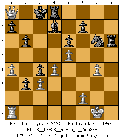 Last move : 1/2-1/2 2020 August 2 18:21:28 [Event "FICGS__CHESS__RAPID_A__000255"] [Site "FICGS"] [Date "2020.06.09"] [Round "1"] [White "Broekhuizen,A. T. S."] [Black "Hallqvist,Niklas"] [Result "1/2-1/2"] [WhiteElo "1919"] [BlackElo "1992"] 1.e4 e6 2.d4 d5 3.Nc3 Bb4 4.e5 c5 5.a3 Bxc3+ 6.bxc3 Qc7 7.Qg4 Ne7 8.Bd3 c4 9.Be2 Qa5 10.Bd2 Nf5 11.h4 Qa4 12.Nf3 Qxc2 13.h5 h6 14.O-O Bd7 15.a4 b6 16.Bd1 Qb2 17.Rc1 Nc6 18.Bc2 Rg8 19.Qh3 Na5 20.g4 Ne7 21.Bh7 Rh8 22.Rb1 Qa3 23.Ra1 Qb3 24.Rfb1 Rxh7 25.Rxb3 cxb3 26.Bf4 Rh8 27.Nd2 g6 28.hxg6 Nxg6 29.Bxh6 O-O-O 30.Qe3 Nc4 31.Nxc4 dxc4 32.Qf3 Rxh6 33.Qa8+ 1/2-1/2 French : Winawer, Classical variation Kingside Castling by player White (move 14) Queenside Castling by player Black (move 29) This chess game ended in a draw. Follow this game move after move (download)All I want to do, ever, is just play Chess. (Bobby Fischer) Wenn du auf das Glück wartest, wird das Leben ziemlich langweilig. (Mikhail Nekhemyevich Tal) De eso se trata el Ajedrez. Un día le das una lección a tu oponente y al día siguiente el te da una a tí. (Bobby Fischer) Toute estimation doit être constamment réévaluée. (Jacob Estrin) God is an atheist. (Unknown)