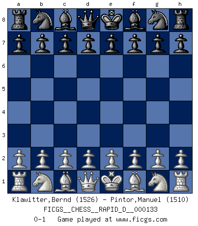 Last move : 0-1 2020 July 9 11:7:22 [Event "FICGS__CHESS__RAPID_D__000133"] [Site "FICGS"] [Date "2020.06.09"] [Round "1"] [White "Klawitter,Bernd"] [Black "Pintor,Manuel"] [Result "0-1"] [WhiteElo "1526"] [BlackElo "1510"] 0-1 This chess game has been lost on time (started : 2020.06.09 1:16:13) Player Black won this chess game. Follow this game move after move (download)I know people who have all the will in the world, but still can't play good Chess. (Bobby Fischer) Ich war zu klein für die Schach-Schülermannschaft! (Woody Allen) El Ajedrez es el juego mas altamente simbólico, pero las agresiones estan por lo tanto aún mas francamente representadas en la partida. Tal vez comenzo como un juego de guerra; Algo como la representación de una batalla en miniatura entre las fuerzas de dos reinos. (Karl Meninger) Votre prénom est 'Tactique', votre deuxième prénom est 'Tactique' et votre nom est 'Tactique'. (Ken Smith) Everybody lies. (Gregory House, House M.D.)