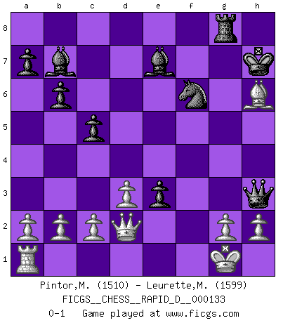 Last move : 0-1 2020 June 15 22:25:29 [Event "FICGS__CHESS__RAPID_D__000133"] [Site "FICGS"] [Date "2020.06.09"] [Round "1"] [White "Pintor,Manuel"] [Black "Leurette,Marc-Antoine"] [Result "0-1"] [WhiteElo "1510"] [BlackElo "1599"] 1.e4 e5 2.f4 d6 3.Nf3 exf4 4.Bc4 Nf6 5.Nc3 b6 6.O-O Bb7 7.d3 Be7 8.Ng5 O-O 9.Bxf4 Nc6 10.Ne2 Ne5 11.Bb3 h6 12.Nf3 Nxf3+ 13.Rxf3 Qd7 14.Ng3 c5 15.Nf5 d5 16.Nxh6+ gxh6 17.Bxh6 dxe4 18.Rg3+ Kh7 19.Qd2 Rg8 20.Rh3 Qxh3 21.Bxf7 e3 22.Bxg8+ Rxg8 0-1 King's gambit Kingside Castling by player White (move 6) Kingside Castling by player Black (move 8) Player Black won this chess game. Follow this game move after move (download)If you aren't afraid of Spassky, then I have removed the element of money. (Jim Slater) Das Schachspiel übertrifft alle anderen Spiele so weit wie der Chimborasso einen Misthaufen. (Arthur Schopenhauer) No volvere nunca a jugar contigo. Has insultado a mi amigo. - cuando un oponente se maldijo por una mala jugada (Miguel Najdorf) Avec des compensations pour le matériel en plus... (Anonyme) Locking firmely the window serves nothing, only small thiefs pass through there, the big thiefs enter through the front door. (Luc-Olivier Leclerc)
