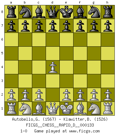 Last move : 1-0 2020 July 9 11:7:22 [Event "FICGS__CHESS__RAPID_D__000133"] [Site "FICGS"] [Date "2020.06.09"] [Round "1"] [White "Autobello,Giovanni"] [Black "Klawitter,Bernd"] [Result "1-0"] [WhiteElo "1567"] [BlackElo "1526"] 1.d4 1-0 This chess game has been lost on time (started : 2020.06.09 1:16:13) Queen's pawn Player White won this chess game. Follow this game move after move (download)Chess is a forcing house where the fruits of character can ripen more fully than in life. (Edward Morgan Foster) Du weisst es gibt ein Problem mit Computern und Fernschach, wenn jeder eine Rating von 2450 hat. (John Christen Knudsen) Debemos de asegurarnos de que el Ajedrez no se convierta en un lenguaje muerto, muy interesante, pero tan solo para un grupo muy pequeño. (Sytze Faber) La vie et les Echecs sont tous les deux une lutte constante. (Lasker) May the force be with you. (Han Solo in Star Wars ep.4)