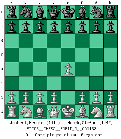 Last move : 1-0 2020 July 9 23:56:20 [Event "FICGS__CHESS__RAPID_D__000133"] [Site "FICGS"] [Date "2020.06.09"] [Round "1"] [White "Joubert,Hennie"] [Black "Haack,Stefan"] [Result "1-0"] [WhiteElo "1414"] [BlackElo "1442"] 1.e4 1-0 This chess game has been lost on time (started : 2020.06.09 1:16:13) King's pawn Opening Player White won this chess game. Follow this game move after move (download)Chess, like love, is infectious at any age. (Flohr) Vielleicht wirkt die Aura früherer Spieler glanzvoller als die der heutigen Spieler, aber das liegt daran, dass man kein Programm wie Fritz hatte, das einem all die Löcher in ihren Partien zeigt. (Vladimir Kramnik) Puntos débiles o agujeros en la posición de tu oponente deben de ser ocupados por piezas, no Peones. (Siegbert Tarrasch) Je fais ceci parce que dans cinquante coups j'obtiendrai cela; je m'appelle Mikhail Moisevitch Botvinnik. (Botvinnik) The meaning of life is that it is to be lived, and it is not to be traded and conceptualized and squeezed into a pattern of systems. (Bruce Lee)