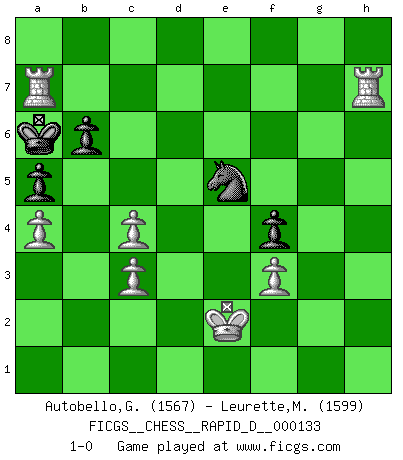 Last move : 1-0 2020 August 18 23:44:47 [Event "FICGS__CHESS__RAPID_D__000133"] [Site "FICGS"] [Date "2020.06.09"] [Round "1"] [White "Autobello,Giovanni"] [Black "Leurette,Marc-Antoine"] [Result "1-0"] [WhiteElo "1567"] [BlackElo "1599"] 1.e4 e5 2.Nf3 Nc6 3.Bc4 Nf6 4.Ng5 Bc5 5.Nxf7 Bxf2+ 6.Kxf2 Nxe4+ 7.Ke3 Qe7 8.Nxh8 Qg5+ 9.Kxe4 Qf4+ 10.Kd3 Qd4+ 11.Ke2 Qxc4+ 12.d3 Qg8 13.Be3 d6 14.Nd2 Bg4+ 15.Nf3 O-O-O 16.h3 Bxf3+ 17.gxf3 Qxh8 18.Qg1 b6 19.Qg4+ Kb7 20.Rhg1 g6 21.a4 a5 22.c3 d5 23.h4 Qe8 24.Kd2 Qf7 25.Bg5 d4 26.Bxd8 dxc3+ 27.bxc3 Nxd8 28.Qe4+ Nc6 29.Rg5 Qf4+ 30.Qxf4 exf4 31.h5 gxh5 32.Rxh5 h6 33.Rxh6 Ne5 34.Ke2 c5 35.Rg1 c4 36.Rg7+ Ka6 37.R6h7 Nc6 38.dxc4 Ne5 39.Ra7+ 1-0 Two knights defense : Wilkes Barre (Traxler) variation Queenside Castling by player Black (move 15) Player White won this chess game. Follow this game move after move (download)Fischer is completely natural. He plays no roles. He's like a child. Very, very simple. (Zita Rajcsanyi) Wenn ich Weiß habe gewinne ich weil ich Weiß habe, wenn ich Schwarz habe gewinne ich weil ich Bogoljubov bin. (Efim Bogoljubov) En el tablero, la mentira e hipocresía no sobreviven mucho. (Emanuel Lasker) Les échecs, c'est l'imagination. (David Bronstein) If computers get too powerful, we can organize them into committees. That'll do them in. (Anonymous)