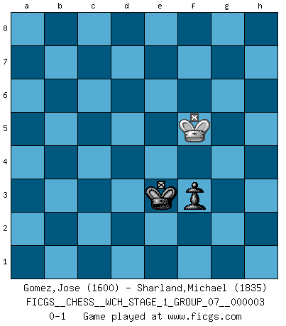 Last move : 0-1 2007 October 10 2:50:1 [Event "FICGS__CHESS__WCH_STAGE_1_GROUP_07__000003"] [Site "FICGS"] [Date "2007.07.11"] [Round "1"] [White "Gomez,Jose"] [Black "Sharland,Michael"] [Result "0-1"] [WhiteElo "1600"] [BlackElo "1835"] 1.Nf3 Nf6 2.d4 e6 3.Bg5 h6 4.Bh4 b6 5.c4 Be7 6.Nc3 Bb7 7.e3 O-O 8.Bd3 c5 9.O-O Nc6 10.Bxf6 Bxf6 11.Be4 Rc8 12.Qa4 cxd4 13.exd4 a6 14.Rfc1 b5 15.cxb5 axb5 16.Nxb5 Nxd4 17.Rxc8 Nxf3+ 18.Bxf3 Qxc8 19.Nd6 Qa8 20.Qxa8 Bxa8 21.Rb1 Bxf3 22.gxf3 Ra8 23.a3 Kf8 24.Ne4 Bd4 25.Nd6 Be5 26.Nc4 Bc7 27.Re1 d5 28.Ne3 Rc8 29.Kg2 d4 30.Nf1 Bf4 31.b4 d3 32.Rd1 Rc3 33.a4 Ke7 34.a5 Rb3 35.Ng3 g6 36.Ne4 Rxb4 37.Nc5 Bd6 38.Ne4 Rb3 39.Nxd6 Kxd6 40.Ra1 Kc7 41.f4 d2 42.a6 Ra3 43.Rd1 Rd3 44.Kf1 Rd4 45.Ke2 Kb6 46.Rxd2 Rxd2+ 47.Kxd2 Kxa6 48.Kd3 Kb6 49.Ke4 f6 50.Kd4 Kc6 51.Ke4 Kd6 52.h4 Kc5 53.Kd3 Kd5 54.Ke3 e5 55.h5 gxh5 56.fxe5 Kxe5 57.Kf3 f5 58.Kg2 Kf4 59.Kh3 Kf3 60.Kh4 Kxf2 61.Kxh5 Kf3 62.Kxh6 f4 63.Kg5 Ke3 64.Kf5 f3 0-1 Reti Opening Kingside Castling by player Black (move 7) Kingside Castling by player White (move 9) 10 pieces endgame at move 47 : White KPPPP , Black KPPPP WHITE : King + 4 Pawns BLACK : King + 4 Pawns 9 pieces endgame at move 47 : White KPPP , Black KPPPP WHITE : King + 3 Pawns BLACK : King + 4 Pawns 8 pieces endgame at move 55 : White KPP , Black KPPPP WHITE : King + 2 Pawns BLACK : King + 4 Pawns 7 pieces endgame at move 56 : White KPP , Black KPPP WHITE : King + 2 Pawns BLACK : King + 3 Pawns 6 pieces endgame at move 56 : White KP , Black KPPP WHITE : King + 1 Pawn BLACK : King + 3 Pawns 5 pieces endgame at move 60 : White K , Black KPPP WHITE : King + BLACK : King + 3 Pawns 4 pieces endgame at move 61 : White K , Black KPP WHITE : King + BLACK : King + 2 Pawns 3 pieces endgame at move 62 : White K , Black KP WHITE : King + BLACK : King + 1 Pawn Player Black won this chess game. Follow this game move after move (download)It's always better to sacrifice your opponent's men. (Savielly Tartakover) Es gibt zwei Arten von Opfern: Korrekte und meine. (Mikhail Nekhemyevich Tal) Todos los jugadores de Ajedrez deberían tener un pasatiempo. (Savielly Tartakower) Il n'y a plus de joueurs du niveau de Jacob Murray dont la seule quête est le beau jeu, le plaisir de voir les pièces construire quelque chose. Sur 10 idées à la minute, 9 seront sans intérêt, la dernière s'avèrera géniale. (Christian Bauer) Two beer, or not two beer. (Unknown)