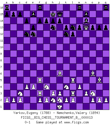 Last move : 0-1 2020 October 31 19:3:29 [Event "FICGS__BIG_CHESS__TOURNAMENT_B__000013"] [Site "FICGS"] [Date "2020.06.09"] [Round "1"] [White "Yarkov,Evgeny"] [Black "Nemchenko,Valery"] [Result "0-1"] [WhiteElo "1788"] [BlackElo "1894"] 1.j2-k4 h15-g13 2.h1-o7 p16-o14 3.m2-m4 k16-l14 4.l1-p5 g15-g14 5.b1-c3 b16-c14 6.p1-o3 m15-m13 7.n2-n3 n15-n13 8.o1-j6 d15-d14 9.d2-d4 l16-n14 10.c1-l9 f15-f14 11.e2-e4 e15-e13 12.f1-b5 k15-k13 13.e1-e3 o16-n15 14.e3-f3 j15-h13 15.a1-e1 c16-h11 16.b5-h11 g13-h11 17.e1-e3 g16-j15 18.m1-m3 l14-k12 19.q1-m1 l15-l13 20.h2-g4 c14-d12 21.k1-h2 f16-e15 22.m3-l3 l13-l12 23.g1-j2 j16-h15 24.m1-m3 k12-j10 25.l9-o6 e16-f16 26.o7-o10 o14-n12 27.o10-j10 h13-k12 28.j10-p10 p15-p13 29.f3-f5 j15-h13 30.e3-f3 h11-g13 31.l3-l5 o15-o13 32.m3-l3 q15-q13 33.p10-f10 g13-e12 34.f10-l15 h16-j15 35.l15-n13 n12-l13 0-1 This big chess game has been lost on time (started : 2020.06.09 1:17:59) Follow this game move after move (download)I'd rather have a Pawn than a finger. (Reuben Fine) Nie in meinem Leben habe ich die französische Verteidigung gespielt, welche die Stumpfsinnigste von allen ist. (Wilhelm Steinitz) A la fecha, Fischer esta simplemente un nivel arriba de todos los mejores jugadores de Ajedrez del mundo. (John Jacobs) Tous ces prétendus hommes politiques sont les pions, les Cavaliers, les Tours ou les Fous d'une partie d'échecs qui se jouera tant qu'un hasard ne renversera pas l'échiquier. (Honoré de Balzac) Control your own destiny or someone else will. (Jack Welch)