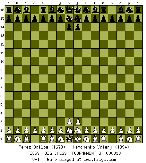 Last move : 0-1 2020 July 9 11:7:22 [Event "FICGS__BIG_CHESS__TOURNAMENT_B__000013"] [Site "FICGS"] [Date "2020.06.09"] [Round "1"] [White "Perez,Dailos"] [Black "Nemchenko,Valery"] [Result "0-1"] [WhiteElo "1679"] [BlackElo "1894"] 0-1 This big chess game has been lost on time (started : 2020.06.09 1:17:59) Follow this game move after move (download)If I win a tournament, I win it by myself. I do the playing. Nobody helps me. (Bobby Fischer) Die jungen Leute sollen verstehen, dass sie noch etwas von mir lernen können und müssen. (Viktor Kortschnoi) En manos de Fischer's, una diminuta ventaja teórica es tan buena como tener una Reina de ventaja. (Isaac Kashdan) Le jeu d'échecs est comme rejeté hors du temps. (Antoine de Saint-Exupéry) Nothing is more important for teaching us to understand the concepts we have than constructing fictitious ones. (Ludwig Wittgenstein)