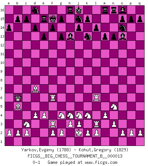 Last move : 0-1 2020 October 24 10:56:2 [Event "FICGS__BIG_CHESS__TOURNAMENT_B__000013"] [Site "FICGS"] [Date "2020.06.09"] [Round "1"] [White "Yarkov,Evgeny"] [Black "Kohut,Gregory"] [Result "0-1"] [WhiteElo "1788"] [BlackElo "1829"] 1.j2-k4 p16-o14 2.h1-o7 h15-g13 3.e2-e4 b16-c14 4.f1-b5 e15-e13 5.b1-c3 m15-m13 6.d2-d4 j15-k13 7.m2-m4 g16-j15 8.h2-g4 f16-c13 9.l1-p5 k16-h15 10.c1-l9 d15-d14 11.n2-n3 n15-n14 12.o1-f9 l16-m15 13.p1-o3 o16-n15 14.e1-e3 c16-e14 15.m1-m3 f15-f14 16.a1-e1 h16-f16 17.m3-l3 l15-l14 18.e3-f3 e14-f15 19.o7-p7 q16-p16 20.e1-e3 f16-e15 21.q1-m1 a15-a14 22.k1-h2 f15-h13 23.m1-m3 e15-f15 24.g1-j2 h13-p6 25.m3-m2 c13-b14 26.o3-n5 p6-h13 27.m2-m3 h15-j13 28.l3-l6 m16-o16 29.m3-l3 b14-g9 30.l9-j7 g9-k12 31.j7-m10 k12-m10 32.p7-m10 o16-m16 33.f3-f6 p16-n16 34.e3-f3 n15-o16 35.j2-h4 e16-e15 36.f9-d7 a16-e16 37.p5-g13 h14-g13 38.m10-j13 e16-h16 39.j13-b6 c14-d16 40.h2-j4 n14-n13 41.j1-j2 m15-o13 0-1 This big chess game has been lost on time (started : 2020.06.09 1:17:59) Follow this game move after move (download)You need not play well - just help your opponent to play badly. (Genrikh Chepukaitis) Ich habe kein Problem mit Frauen, sondern nur mit dem Niveau ihres Schachspiels (Judith Polgar) El Ajedrez es una guerra en un tablero. El objetivo es aplastar la mente del oponente. (Bobby Fischer) Les Echecs représentent une sphère d'idées créatrices basée sur la volonté des deux protagonistes. (Smyslov) A generalist learns less and less about more and more until he knows nothing about everything. (Author unknown)
