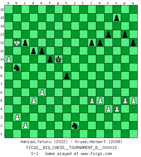 Last move : 0-1 2021 January 31 22:54:50 [Event "FICGS__BIG_CHESS__TOURNAMENT_B__000013"] [Site "FICGS"] [Date "2020.06.09"] [Round "1"] [White "Aahlad,Yeturu"] [Black "Kruse,Herbert"] [Result "0-1"] [WhiteElo "2022"] [BlackElo "2038"] 1.j2-k4 h15-g13 2.h1-o7 m15-m13 3.e2-e4 j15-k13 4.b1-c3 p16-o14 5.f1-b5 b16-c14 6.m2-m4 e15-e13 7.p1-o3 f16-b12 8.d2-d3 d15-d14 9.l1-p5 k16-h15 10.c1-l9 h16-l13 11.h2-g4 g16-j15 12.n2-n3 l16-p12 13.o1-f9 c16-l8 14.g1-j2 n15-n14 15.k1-h2 l13-e7 16.o7-e7 o16-e7 17.c3-d5 e7-f8 18.e4-e5 e16-e14 19.e1-e4 e14-f14 20.a1-e1 m16-m14 21.m4-m5 m14-l14 22.m1-m4 q16-m16 23.q1-m1 a16-e16 24.g4-f6 l14-l11 25.e4-j4 l8-n10 26.k4-l6 j16-k16 27.e1-e4 m16-m14 28.j2-k4 m14-l14 29.l9-k10 l11-a11 30.a2-a4 f8-g7 31.k10-g7 b12-g7 32.m1-m3 a11-a9 33.f9-g8 n10-l12 34.h2-g4 g7-h8 35.m4-q4 l12-g8 36.f6-g8 p12-g4 37.j4-g4 f14-f2 38.d5-e3 h8-k6 39.g8-f6 f2-e2 40.p5-m8 k6-m8 41.l6-m8 l14-l8 42.k4-l6 a9-p9 43.g4-p4 p9-p4 44.q4-p4 o14-n16 45.b5-g10 l8-b8 46.b2-b3 b8-b10 47.g10-k7 e2-e1 48.j1-j2 e1-o1 49.m3-m2 e13-e12 50.e4-b4 b10-b12 51.b4-b12 c14-b12 52.m2-n2 e16-e13 53.l6-k4 e13-c13 54.k4-m3 o1-e1 55.f6-d5 c13-c8 56.m8-l6 p15-p14 57.n2-n1 e1-n1 58.m3-n1 f15-f13 59.q2-q4 q15-q13 60.p4-c4 c8-c4 61.e3-c4 n16-m14 62.o3-n5 k13-l11 63.l6-k8 h15-j13 64.c4-d6 g15-g14 65.o2-o4 j15-h13 66.p2-p4 k16-j15 67.l2-l4 d14-d13 68.k2-k4 k15-k13 69.n3-n4 l15-l13 70.n5-m7 h13-j11 71.g2-g4 j13-h11 72.d6-e8 h11-j9 73.k7-j6 j11-g10 74.d5-f6 g10-h8 75.j6-h5 g13-f11 76.m7-l9 l13-l12 77.n1-m3 b12-d11 78.m3-l5 m14-n12 79.l5-k7 j9-k7 80.l9-k7 l11-k9 81.k7-h8 k9-h8 82.q4-q5 g14-g13 83.h5-l8 g13-g12 84.k8-j10 h8-j10 85.l8-j10 h14-h13 86.p4-p5 j15-h14 87.j3-j4 j14-j13 88.l4-l5 j13-j12 89.h3-h4 k13-k12 90.j4-j5 k12-k11 91.j10-m7 h14-j13 92.g4-g5 j12-j11 93.k4-k5 j11-j10 94.h4-h5 h13-h12 95.k5-k6 h12-h11 96.h5-h6 j13-h12 97.h6-h7 e12-e11 98.g5-g6 h11-h10 99.j5-j6 f13-f12 100.f6-d7 f11-e9 101.d7-e9 d11-e9 102.m7-h3 c15-c13 103.j6-j7 d13-d12 104.h3-e6 b15-b13 105.g6-g7 d12-d11 106.g7-g8 c13-c12 107.j7-j8 f12-f11 108.g8-g9 g12-g11 109.g9-h10 g11-h10 110.h7-h8 h12-g11 111.h8-h9 j10-j9 112.j2-j3 q13-q12 113.j3-h4 p14-p13 114.h4-g5 k11-k10 115.g5-f6 n14-n13 116.f6-e7 n12-l11 117.e7-d8 f11-f10 118.e8-d6 m13-m12 119.d6-c8 e9-f11 120.d3-d4 f11-g9 121.k6-k7 k10-k9 122.c8-b10 k9-j8 123.k7-j8 g9-j8 124.e6-d7 l11-m9 125.d7-g10 j8-g9 126.g10-c14 g9-e10 127.d8-c8 e10-d12 128.c14-d15 m9-k8 129.c8-b9 k8-h9 130.b9-a10 j9-j8 131.a10-a11 a15-a13 132.b10-c12 b13-c12 133.a11-a12 d12-b11 134.d15-b13 b11-d10 135.a12-a13 j8-j7 136.b13-a12 j7-j6 137.a12-f7 g11-g10 138.a4-a5 j6-j5 139.a5-a6 h9-f8 140.e5-e6 h10-h9 141.a6-a7 f8-h7 142.d4-d5 h7-g5 143.f7-g6 j5-j4 144.a7-a8 j4-j3 145.g6-f5 g5-j4 146.a13-b12 j4-g3 147.f5-h3 j3-j2 148.h3-j2 g3-j2 149.a8-a9 h9-h8 150.a9-a10 d10-b9 0-1 Follow this game move after move (download)Chess is in its essence a game, in its form an art, and in its execution a science. (Baron Tassilo) Ein Schachspiel besteht aus drei Phasen: Die erste, wenn du hofftst den Vorteil zu haben, die zweite, wenn du glaubst einen Vorteil zu haben, und die dritte.... wenn du weißt Du wirst verlieren. (Savielly Grigorievitsch Tartakower) El Ajedrez es tortura mental. (Garry Kasparov) Je fais ceci parce que dans cinquante coups j'obtiendrai cela; je m'appelle Mikhail Moisevitch Botvinnik. (Botvinnik) Happy endings are just stories that haven't finished yet. (Jane Smith in Mr & Mrs Smith)