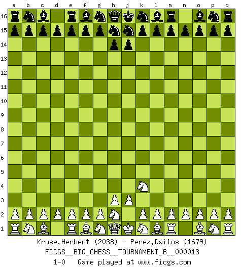 Last move : 1-0 2020 July 9 11:7:22 [Event "FICGS__BIG_CHESS__TOURNAMENT_B__000013"] [Site "FICGS"] [Date "2020.06.09"] [Round "1"] [White "Kruse,Herbert"] [Black "Perez,Dailos"] [Result "1-0"] [WhiteElo "2038"] [BlackElo "1679"] 1.j2-k4 1-0 This big chess game has been lost on time (started : 2020.06.09 1:17:59) Follow this game move after move (download)A man without frontiers. He didn't divide the East and the West, he brought them together in their admiration for him. (Ljubomir Ljubojevic, about Bobby Fischer's death) Warum muß ich gegen diesen IDIOTEN verlieren? (Aaron Nimzowitsch) Si el Ajedrez es una ciencia, es la mas inexacta. Si el Ajedrez es un arte, es demasiado inexacto para ser visto como tal. Si el Ajedrez es un deporte, es demasiado esotérico. Si el Ajedrez es un juego, es demasiado exigente para ser solo un juego. Si el Ajedrez es una aventura, es una muy demandante. Si el Ajedrez es una pasión, es una muy gratificante. Si el Ajedrez es la vida, es una muy triste. (Anónimo) Les échecs, c'est l'imagination. (David Bronstein) The bottom line is always the bottom line. (Johann Piek)