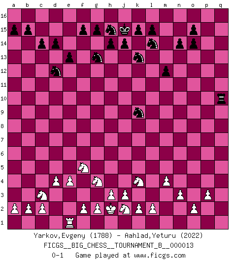Last move : 0-1 2020 October 25 23:52:17 [Event "FICGS__BIG_CHESS__TOURNAMENT_B__000013"] [Site "FICGS"] [Date "2020.06.09"] [Round "1"] [White "Yarkov,Evgeny"] [Black "Aahlad,Yeturu"] [Result "0-1"] [WhiteElo "1788"] [BlackElo "2022"] 1.j2-k4 h15-g13 2.h1-o7 m15-m13 3.d2-d4 e15-e13 4.h2-g4 b16-c14 5.m2-m4 f16-b12 6.c1-h6 b12-h6 7.g4-h6 c14-d12 8.l1-p5 d15-d14 9.k1-h2 p16-o14 10.p1-o3 j15-k13 11.b1-c3 h16-m12 12.h6-f5 c16-k9 13.e2-e4 l16-p12 14.f1-e2 c15-c14 15.e2-p12 m12-p12 16.h2-g4 o14-n12 17.n2-n3 k16-h15 18.o1-j6 p12-p11 19.m1-m3 m16-m14 20.m3-l3 m14-o14 21.o7-m5 m13-m12 22.g1-j2 n15-n14 23.q1-m1 g16-j15 24.e1-e3 j15-l14 25.l3-l9 n12-l11 26.m1-m3 o16-j11 27.l9-l5 o14-o5 28.m5-l6 j11-p5 29.o3-p5 p11-p5 30.l5-o5 k9-o5 31.m3-l3 p5-q4 32.l6-o3 q4-q2 33.j1-h2 o5-j10 34.p2-p3 q2-q14 35.a1-q1 q14-o14 36.o3-o14 p15-o14 37.l3-l7 j16-j15 38.j6-h7 j10-k9 39.h7-k9 l11-k9 40.l7-q7 q15-q13 41.q7-q13 q16-q13 42.q1-q13 e16-q16 43.q13-q16 a16-q16 44.e3-e1 q16-q10 0-1 This big chess game has been lost on time (started : 2020.06.09 1:17:59) Follow this game move after move (download)On the chessboard, lies and hypocrisy do not survive long. (Emanuel Lasker) Wer mein Gambit spielt, muß bereit sein, alle Brücken hinter sich abzubrechen. Es verändert den ganzen Menschen. Es wirkt wie ein Zauberstab und fördert verkümmerte, gute Charakter- eigenschaften wieder zu Tage. (Emil Joseph Diemer) Yo siempre he tenido un ligero sentimiento de lástima por una persona que no tiene conocimiento del Ajedrez. (Siegbert Tarrasch) Je crois qu'il existe des manières très spécifiques de jouer efficacement contre une machine. Evidemment, nous n'avons aucune chance en technique pure, parce que l'ordinateur calcule de manière parfaite. Mais lorsque nous faisons appel à notre cerveau, en utilisant l'intuition et la compréhension, alors nous restons beaucoup plus forts. (Anatoli Karpov) History is the quarrels of popes and kings, with wars or pestilences in every page; the men all so good for nothing, and hardly any women at all. (Jane Austen)