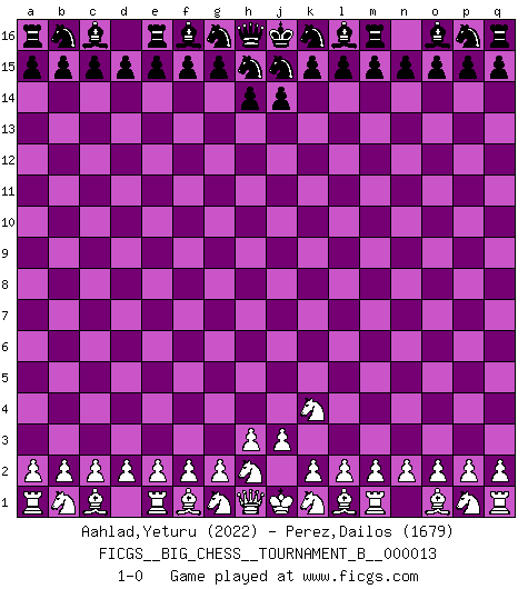 Last move : 1-0 2020 July 9 11:7:22 [Event "FICGS__BIG_CHESS__TOURNAMENT_B__000013"] [Site "FICGS"] [Date "2020.06.09"] [Round "1"] [White "Aahlad,Yeturu"] [Black "Perez,Dailos"] [Result "1-0"] [WhiteElo "2022"] [BlackElo "1679"] 1.j2-k4 1-0 This big chess game has been lost on time (started : 2020.06.09 1:17:59) Follow this game move after move (download)The way he plays Chess demonstrates a man's whole nature. (Stanley Ellin) Schach ist eine Sache der genauen Beurteilung, wann man zuschlagen und wann man sich ducken muss. (Robert James Fischer) El jugador de combinación piensa hacia adelante; comienza de la posición dada y trabaja las movidas contundentes en su mente. (Emanuel Lasker) Vous savez, camarade Pachman, je n'éprouve pas de plaisir à être ministre, je jouerais plutôt aux échecs comme vous, ou alors ferais une révolution au Venezuela. (Che Guevara à Ludek Pachman, 'Checkmate in Prague', 1975) You know what they say : You lie down with the Devil, you wake up in Hell. (Horatio Caine, C.S.I. Miami)