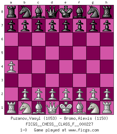 Last move : 1-0 2020 July 20 10:36:46 [Event "FICGS__CHESS__CLASS_F__000227"] [Site "FICGS"] [Date "2020.06.09"] [Round "1"] [White "Puzanov,Vasyl"] [Black "Bromo,Alexis"] [Result "1-0"] [WhiteElo "1053"] [BlackElo "1150"] 1.a4 1-0 This chess game has been lost on time (started : 2020.06.09 11:26:11) Ware (Meadow Hay) Opening Player White won this chess game. Follow this game move after move (download)I had a toothache during the first game. In the second game I had a headache. In the third game it was an attack of rheumatism. In the fourth game, I wasn't feeling well. And in the fifth game? Well, must one have to win every game ? (Siegbert Tarrasch) Über Kasparov: Es ist offensichtlich, daß er in einem totalitären Staat aufwuchs und deshalb zu diktatorischen Zügen neigt. (Viktor Kortschnoi) El Ajedrez no es como la vida... ¡tiene reglas!. (Mark Pasternak) Des combinaisons [dans le jeu d'échecs] pareilles à des mélodies. Je crois entendre pour ainsi dire la musique des coups... (Vladimir Nabokov) When a man with money meets a man with experience, the man with experience leaves with money and the man with money leaves with experience. (Anonymous)