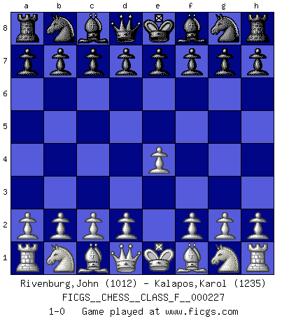 Last move : 1-0 2020 July 20 10:36:46 [Event "FICGS__CHESS__CLASS_F__000227"] [Site "FICGS"] [Date "2020.06.09"] [Round "1"] [White "Rivenburg,John"] [Black "Kalapos,Karol"] [Result "1-0"] [WhiteElo "1012"] [BlackElo "1235"] 1.e4 1-0 This chess game has been lost on time (started : 2020.06.09 11:26:11) King's pawn Opening Player White won this chess game. Follow this game move after move (download)Discovered check is the dive bomber of the Chessboard. (Reuben Fine) Man kann eine Schachpartie nur gewinnen, wenn das Gleichgewicht gestört ist. In einer Stellung mit ungestörtem Gleichgewicht ist auch das größte Genie hilflos - in der Stellung steckt dann eben kein genialer Einfall. (Wilhelm Steinitz) Todavía soy una víctima del Ajedrez. Tiene toda la belleza del arte y mucho mas. No puede ser comercializado. El Ajedrez es mas puro que el arte en su posición social. (Marcel Duchamp) Même un GMI sait rarement calculer sur plus de cinq coups une attaque à sacrifices. (Rudolf Spielmann) I feel so... helpless. (C-3PO in Star Wars ep.3)