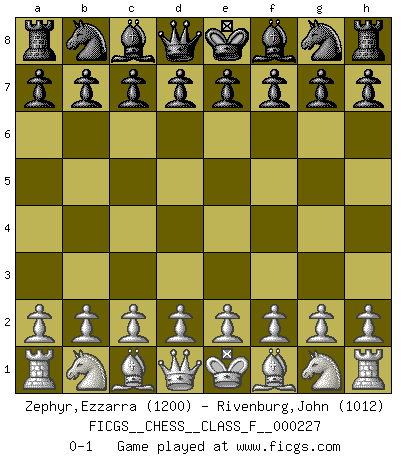 Last move : 0-1 2020 July 19 20:19:26 [Event "FICGS__CHESS__CLASS_F__000227"] [Site "FICGS"] [Date "2020.06.09"] [Round "1"] [White "Zephyr,Ezzarra"] [Black "Rivenburg,John"] [Result "0-1"] [WhiteElo "1200"] [BlackElo "1012"] 0-1 This chess game has been lost on time (started : 2020.06.09 11:26:11) Player Black won this chess game. Follow this game move after move (download)The hardest game to win is a won game. (Emanuel Lasker) Aljechin war kein Nazi. Er war ein Opportunist. Ein schrecklicher Mann. Er liebte Geld über alles und würde für Geld ein Jude, ein Katolik oder ein Protestant werden. (Miguel Najdorf) No nos podemos resistir a la fascinación de un sacrificio ya que la pasión por los sacrificios es parte de la naturaleza de un jugador de Ajedrez. (Rudolf Spielman) Les échecs sont un jeu terrible. Si vous n'avez pas le centre, votre adversaire a une position plus libre. Par contre, si vous avez le centre, alors vous avez vraiment quelque chose pour laquelle vous inquiéter ! (Siegbert Tarrasch) A married woman is like a fish riding a bicycle. (Rodolfo d'Ettorre)