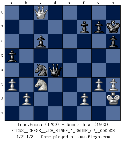 Last move : 1/2-1/2 2007 July 21 4:39:19 [Event "FICGS__CHESS__WCH_STAGE_1_GROUP_07__000003"] [Site "FICGS"] [Date "2007.07.11"] [Round "1"] [White "Ioan,Bucsa"] [Black "Gomez,Jose"] [Result "1/2-1/2"] [WhiteElo "1700"] [BlackElo "1600"] 1.d4 Nf6 2.c4 e6 3.Nf3 d5 4.Bg5 Be7 5.Nc3 h6 6.Bxf6 Bxf6 7.e3 O-O 8.Rc1 c6 9.Be2 Nd7 10.O-O dxc4 11.Bxc4 e5 12.h3 exd4 13.exd4 Nb6 14.Bb3 Re8 15.Re1 Bf5 16.Rxe8+ Qxe8 17.Qd2 Qd7 18.Re1 a5 19.a3 Re8 20.Rxe8+ Qxe8 21.Qf4 Be6 22.Bxe6 Qxe6 23.Qc7 Nc4 24.Qxb7 Bxd4 25.Nxd4 Qe1+ 26.Kh2 Qe5+ 27.g3 Qxd4 28.Qc8+ Kh7 29.Qf5+ Kg8 30.Qc8+ Kh7 31.Qf5+ Kg8 32.Qc8+ Kh7 1/2-1/2 Queen's pawn game Kingside Castling by player Black (move 7) Kingside Castling by player White (move 10) This chess game ended in a draw. Follow this game move after move (download)Live, lose, and learn, by observing your opponent how to win. (Amber Steenbock) Wenn ich einen Club besuche, sind die Spieler stumm vor Staunen. (José Raúl Capablanca) Un mal plan es mejor que no tener ningún plan. (Frank Marshall) A ce moment-là, je menaçais de comprendre la position ! (Clément L'Heureux) SEO proverb : Make your website optimized for human beings, not for search engines.