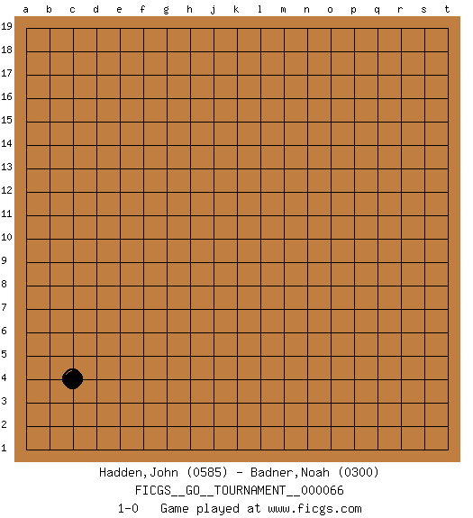 Last move : 1-0 2020 July 10 12:8:28 [Event "FICGS__GO__TOURNAMENT__000066"] [Site "FICGS"] [Date "2020.06.10"] [Round "1"] [Black "Hadden,John"] [White "Badner,Noah"] [Result "1-0"] [Rating 1 "0585"] [Rating 2 "0300"] 1.c4 1-0 This go game has been lost on time (started : 2020.06.10 2:1:31) Here are the names of the openings (joseki) played in the four corners : Corner d4 : c4 1-0 Komoku (Somok, Xiao~mu`) 3-4 Point. The komoku (3-4) point is the traditional corner enclosure move.. Player Black won this Go (weiqi, baduk) game. Follow this game move after move (download)Good moves and bad moves are bedfellows. (Anonymous) The meaning of life is that it is to be lived, and it is not to be traded and conceptualized and squeezed into a pattern of systems. (Bruce Lee)