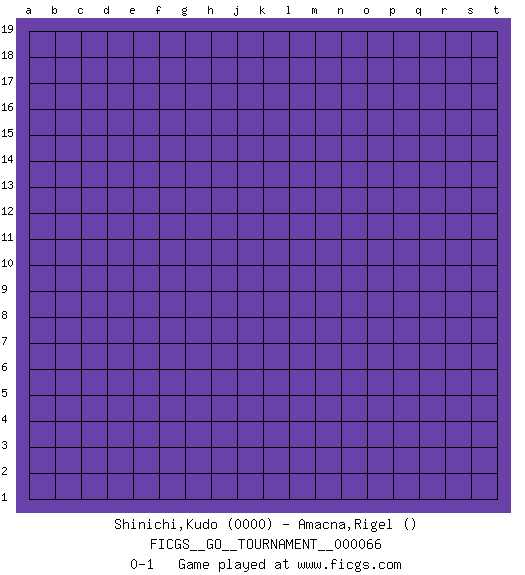 Last move : 0-1 2020 July 10 12:8:28 [Event "FICGS__GO__TOURNAMENT__000066"] [Site "FICGS"] [Date "2020.06.10"] [Round "1"] [Black "Shinichi,Kudo"] [White "Amacna,Rigel"] [Result "0-1"] [Rating 1 "0000"] 0-1 This go game has been lost on time (started : 2020.06.10 2:1:31) Here are the names of the openings (joseki) played in the four corners : Player White won this Go (weiqi, baduk) game. Follow this game move after move (download)Learning josekis by heart is useless if you don't try departing from them. (Pierre Audouard) We're missing something. (Gregory House, House M.D.)