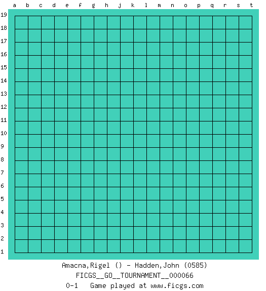 Last move : 0-1 2020 July 10 12:8:28 [Event "FICGS__GO__TOURNAMENT__000066"] [Site "FICGS"] [Date "2020.06.10"] [Round "1"] [Black "Amacna,Rigel"] [White "Hadden,John"] [Result "0-1"] [Rating 2 "0585"] 0-1 This go game has been lost on time (started : 2020.06.10 2:1:31) Here are the names of the openings (joseki) played in the four corners : Player White won this Go (weiqi, baduk) game. Follow this game move after move (download)Go is essentially a form of harmony. Go in the 21st century will have to be go of the 'harmony of the six points - the four quarters, the above and the below.' As in life we will need to view the whole rather than the part. Japanese go has focused too heavily on the local (joseki) rather than the whole for 300 years. The reason the Chinese and Koreans are overtaking the Japanese is that they are closer to achieve this whole-board view. (Go Seigen, 9p, 1994) Waiting for chance ? Play in casinos. (FICGS proverb)