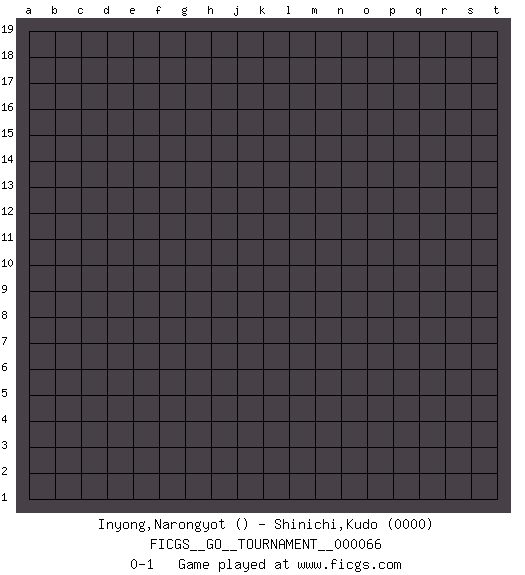 Last move : 0-1 2020 July 10 12:8:28 [Event "FICGS__GO__TOURNAMENT__000066"] [Site "FICGS"] [Date "2020.06.10"] [Round "1"] [Black "Inyong,Narongyot"] [White "Shinichi,Kudo"] [Result "0-1"] [Rating 2 "0000"] 0-1 This go game has been lost on time (started : 2020.06.10 2:1:31) Here are the names of the openings (joseki) played in the four corners : Player White won this Go (weiqi, baduk) game. Follow this game move after move (download)In the sound of the stone you can hear its purpose. (Pierre Audouard) Whenever people agree with me, I always feel I must be wrong. (Oscar Wilde)