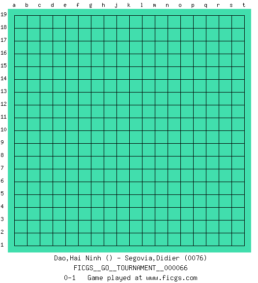 Last move : 0-1 2020 July 10 12:8:28 [Event "FICGS__GO__TOURNAMENT__000066"] [Site "FICGS"] [Date "2020.06.10"] [Round "1"] [Black "Dao,Hai Ninh"] [White "Segovia,Didier"] [Result "0-1"] [Rating 2 "0076"] 0-1 This go game has been lost on time (started : 2020.06.10 2:1:31) Here are the names of the openings (joseki) played in the four corners : Player White won this Go (weiqi, baduk) game. Follow this game move after move (download)Big groups never die. (Anonymous) Computers make it easier to do a lot of things, but most of the things they make it easier to do don't need to be done. (Andy Rooney)