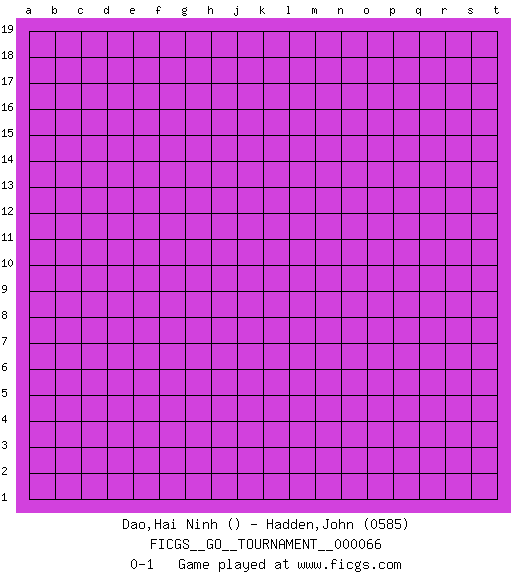 Last move : 0-1 2020 July 10 12:8:28 [Event "FICGS__GO__TOURNAMENT__000066"] [Site "FICGS"] [Date "2020.06.10"] [Round "1"] [Black "Dao,Hai Ninh"] [White "Hadden,John"] [Result "0-1"] [Rating 2 "0585"] 0-1 This go game has been lost on time (started : 2020.06.10 2:1:31) Here are the names of the openings (joseki) played in the four corners : Player White won this Go (weiqi, baduk) game. Follow this game move after move (download)When your opponent is thick, you must also become thick. (Otake Hideo, 9p) As the days dwindle down... to a precious few. (Maxwell Anderson)