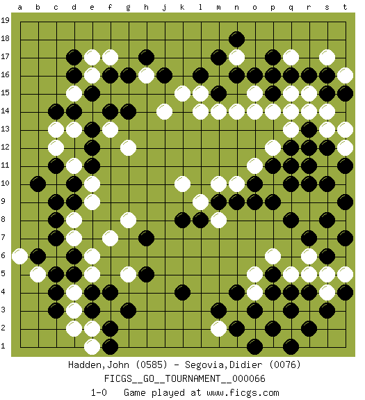 Last move : 1-0 2020 October 27 1:16:15 [Event "FICGS__GO__TOURNAMENT__000066"] [Site "FICGS"] [Date "2020.06.10"] [Round "1"] [Black "Hadden,John"] [White "Segovia,Didier"] [Result "1-0"] [Rating 1 "0585"] [Rating 2 "0076"] 1.c4 q14 2.r4 n14 3.d17 c10 4.c14 g12 5.g14 j14 6.j16 l15 7.r16 p16 8.p17 q15 9.k4 k10 10.q10 r15 11.q16 s17 12.s16 t16 13.t15 s14 14.s15 t13 15.o16 o15 16.n16 q17 17.p15 p14 18.p16 o14 19.l16 m16 20.m17 n17 21.n18 k15 22.m15 m14 23.k8 l14 24.c8 g8 25.h7 e6 26.d6 e5 27.e4 d4 28.d5 d3 29.f4 g5 30.c3 e2 31.e3 d2 32.f2 e1 33.f1 f3 34.g3 d7 35.c7 d8 36.c9 f7 37.h5 l9 38.n9 m10 39.l8 m8 40.m9 n10 41.o9 q11 42.r11 p10 43.p11 r12 44.q12 o11 45.o10 p12 46.p9 q13 47.q11 s11 48.s10 t10 49.t9 s9 50.t11 t12 51.s12 s13 52.r13 r14 53.r12 r9 54.q8 q9 55.s8 r8 56.r7 s7 57.r10 r6 58.s6 s5 59.t7 r5 60.t4 s4 61.q4 r3 62.q3 q5 63.r2 q2 64.s3 t5 65.p5 p6 66.p4 p3 67.o3 o4 68.p2 p1 69.q1 o2 70.o1 n3 71.n2 m2 72.n4 o5 73.m3 c6 74.c5 b5 75.b6 a6 76.d9 e9 77.e11 e10 78.d10 d11 79.e12 f13 80.f14 e14 81.e13 d13 82.d14 c13 83.c11 c12 84.b10 d15 85.e15 e16 86.d16 e17 87.f16 f17 88.g16 h16 89.h17 1-0 Here are the names of the openings (joseki) played in the four corners : Corner q4 : r4 l9 Komoku (Somok, Xiao~mu`) 3-4 Point. The komoku (3-4) point is the traditional corner enclosure move.. Player Black won this Go (weiqi, baduk) game. Follow this game move after move (download)The rectangular six is normally alive. (Anonymous) When the going gets tactical, the computers get going. (Hyatt)