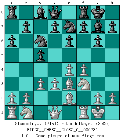 Last move : 1-0 2020 July 23 1:36:11 [Event "FICGS__CHESS__CLASS_A__000231"] [Site "FICGS"] [Date "2020.06.10"] [Round "1"] [White "Slawomir,Weglicki"] [Black "Koudelka,Artur"] [Result "1-0"] [WhiteElo "2151"] [BlackElo "2000"] 1.e4 c5 2.f4 Nc6 3.Nf3 e6 4.Bb5 Nge7 5.O-O a6 6.Be2 g6 7.d3 Bg7 8.c3 O-O 9.Be3 1-0 This chess game has been lost on time (started : 2020.06.10 17:25:40) Sicilian : Grand Prix attack Kingside Castling by player White (move 5) Kingside Castling by player Black (move 8) Player White won this chess game. Follow this game move after move (download)Chess is a fairy tale of 1001 blunders. (Savielly Tartakower) Wenn ich gewinne bin ich ein Genie. Wenn nicht, dann bin ich keines. (Robert James Fischer) ¿Se han dado cuenta de que Fischer casi nunca ha tenido piezas malas? El las intercambia y las piezas malas se quedan con sus oponenets. (Yuri Balashov) Votre seul travail dans les ouvertures est d'obtenir un milieu de partie jouable. (Lajos Portish) Unless in communicating with it one says exactly what one means, trouble is bound to result. (Alan Turing, about computers)