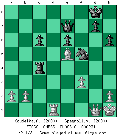 Last move : 1/2-1/2 2020 December 17 0:22:36 [Event "FICGS__CHESS__CLASS_A__000231"] [Site "FICGS"] [Date "2020.06.10"] [Round "1"] [White "Koudelka,Artur"] [Black "Spagnoli,Vincenzo"] [Result "1/2-1/2"] [WhiteElo "2000"] [BlackElo "2000"] 1.e4 Nf6 2.e5 Nd5 3.d4 d6 4.c4 Nb6 5.f4 dxe5 6.fxe5 Nc6 7.Be3 Bf5 8.Nc3 e6 9.Nf3 Be7 10.Be2 O-O 11.O-O f6 12.exf6 Bxf6 13.Qd2 h6 14.Bf2 Qe8 15.Rad1 Rd8 16.Qe3 Bg4 17.Ne4 Bxf3 18.Nxf6+ Rxf6 19.gxf3 Ne7 20.Kh1 Nbc8 21.Qb3 Nd6 22.Bh4 Rf7 23.Bd3 Ndf5 24.Bxf5 Rxf5 25.Qxb7 Rf4 26.Bf2 Rd7 27.Bg3 c6 28.Qa6 Rfxd4 29.Rxd4 Rxd4 30.Qxa7 Rxc4 31.Be5 Qd8 32.Qg1 Nf5 33.Rd1 Qe7 1/2-1/2 Follow this game move after move (download)Not only will I predict his triumph over Botvinnik, but I'll go further and say that he'll probably be the greatest Chess player that ever lived. (John Collins) Gott hat gewollt, dass ich Champion werde. (Surab Azmajparaschvili) Aquellos que dicen que entienden al Ajedrez, no entienden nada. (Robert Hubner) Le moment que je préfère le plus dans une rencontre, c'est celui où je sens que la personnalité de l'adversaire se brise. (Robert Fischer) In fact if nothing is done against this teddy bear, hereby I announce that I would quit chess, rapid chess, blitz chess, postal chess, email chess, server chess and correspondence chess I will then switch to a table game where teddy bears aren't going to be seen for a while, like Poker, or Roulette, all 18+ games. (Elmer Valderrama)