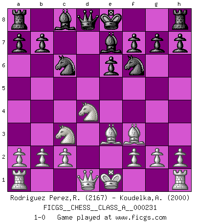 Last move : 1-0 2020 August 1 3:6:51 [Event "FICGS__CHESS__CLASS_A__000231"] [Site "FICGS"] [Date "2020.06.10"] [Round "1"] [White "Rodriguez Perez,Rene"] [Black "Koudelka,Artur"] [Result "1-0"] [WhiteElo "2167"] [BlackElo "2000"] 1.e4 e6 2.d4 d5 3.Bd3 dxe4 4.Bxe4 Nf6 5.Bf3 c5 6.Ne2 Nc6 7.Be3 Be7 8.Nbc3 cxd4 9.Nxd4 1-0 This chess game has been lost on time (started : 2020.06.10 17:25:40) French : Schlechter variation Player White won this chess game. Follow this game move after move (download)In a gambit you give up a Pawn for the sake of getting a lost game. (Samuel Standige Boden) Es ist wirklich schade, dass so viele Schachspieler nicht auf ihr Äußeres achten! (Alexandra Kosteniuk) ¿Quién es tu oponente esta tarde? Esta tarde mi oponente son las piezas negras. (Akiba Rubinstein) D'abord les bases : Jouez et étudiez, puis étudiez et jouez, ensuite jouez et étudiez, puis étudiez et jouez. Deuxièmement : Donnez toujours le meilleur de vous-même ! (Ken Smith) Don't be irreplaceable, if you can't be replaced, you can't be promoted. (Dan Rotaru)