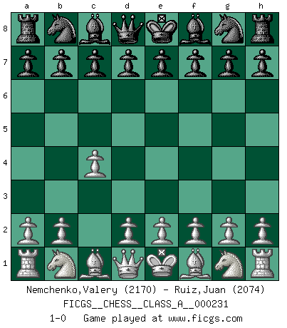 Last move : 1-0 2020 July 24 8:59:12 [Event "FICGS__CHESS__CLASS_A__000231"] [Site "FICGS"] [Date "2020.06.10"] [Round "1"] [White "Nemchenko,Valery"] [Black "Ruiz,Juan"] [Result "1-0"] [WhiteElo "2170"] [BlackElo "2074"] 1.c4 1-0 This chess game has been lost on time (started : 2020.06.10 17:25:40) English Opening Player White won this chess game. Follow this game move after move (download)Methodical thinking is of more use in Chess than inspiration. (C. J. S. Purdy) Der Traum, für den ich lebe, ist der von einem freien Russland. Viele mögen sagen: Russland hat doch ein Parlament, einen gewählten Präsidenten. Aber ich spüre, dass in meiner Heimat die Angst wiederkehrt. Eine Angst, sich frei zu äußern, bestimmte Dinge zu tun (Garry Kasparov) Es el objetivo de la escuela moderna no tratar cada posición de acuerdo a una regla general, sino de acuerdo al principio inherente en la posición. (Richard Reti) C'est la seule position que je connaisse où les deux camps sont mals. Propos prêtés à V. Anand. The production of too many useful things results in too many useless people. (Karl Marx)