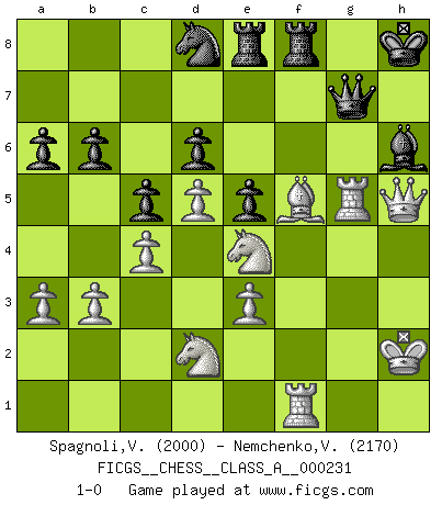 Last move : 1-0 2020 August 22 17:51:37 [Event "FICGS__CHESS__CLASS_A__000231"] [Site "FICGS"] [Date "2020.06.10"] [Round "1"] [White "Spagnoli,Vincenzo"] [Black "Nemchenko,Valery"] [Result "1-0"] [WhiteElo "2000"] [BlackElo "2170"] 1.d4 Nf6 2.Nf3 g6 3.e3 Bg7 4.c4 O-O 5.Nc3 d6 6.Be2 c5 7.O-O Nc6 8.d5 Na5 9.e4 e5 10.Be3 Nh5 11.Re1 Nf4 12.Bf1 b6 13.h3 f5 14.Rc1 fxe4 15.Nxe4 Bf5 16.Nfd2 Qd7 17.a3 Nb7 18.Kh2 Nh5 19.b3 a6 20.Nc3 Nf6 21.g4 Bxg4 22.hxg4 Nxg4+ 23.Kg3 Nxe3 24.fxe3 h5 25.Bh3 Qe8 26.Nce4 Kh8 27.Qe2 Bh6 28.Rg1 g5 29.Rcf1 Qg6 30.Bf5 Qg7 31.Qxh5 Rae8 32.Kh2 Nd8 33.Rxg5 1-0 King's Indian : East Indian defense Kingside Castling by player Black (move 4) Kingside Castling by player White (move 7) Player White won this chess game. Follow this game move after move (download)Don't even mention losing to me. I can't stand to think of it. (Bobby Fischer) Offensichtlich kennt Kasparow nichts anderes als Schach, und ich könnte 500 weitere Spieler dieser Sorte benennen. (Judith Polgar) Los asuntos humanos son como una partida de Ajedrez: solo aquellos que no lo toman seriamente, pueden ser llamados buenos jugadores. (Hung Tzu Ch'eng) Le génie consiste à savoir transgresser les règles au moment opportun. (Teichmann) Employ the attack like tactic of defense. (Chinese proverb)