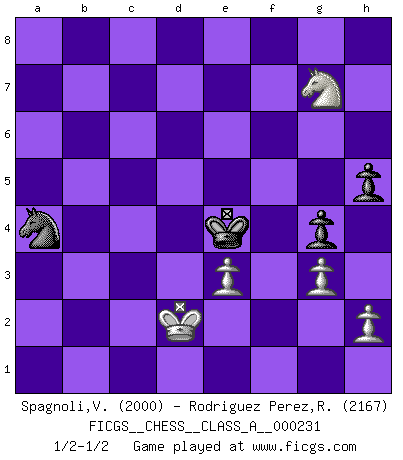 Last move : 1/2-1/2 2020 October 24 17:56:2 [Event "FICGS__CHESS__CLASS_A__000231"] [Site "FICGS"] [Date "2020.06.10"] [Round "1"] [White "Spagnoli,Vincenzo"] [Black "Rodriguez Perez,Rene"] [Result "1/2-1/2"] [WhiteElo "2000"] [BlackElo "2167"] 1.d4 e6 2.Nf3 c5 3.e3 d5 4.c4 Nc6 5.Nc3 Nf6 6.cxd5 exd5 7.Be2 Be6 8.O-O Rc8 9.b3 cxd4 10.Nxd4 Bc5 11.Nxc6 bxc6 12.Ba6 Rc7 13.Bb2 O-O 14.Ne2 Bd6 15.Rc1 Qe7 16.Nf4 Bd7 17.Bd4 Bf5 18.Bd3 Bxd3 19.Qxd3 Ne4 20.Rc2 Rd8 21.Rfc1 c5 22.Bb2 Rcd7 23.g3 Qe8 24.Kg2 d4 25.Nh3 dxe3 26.Qxe3 Re7 27.Qf3 Be5 28.Bxe5 Rxe5 29.Re1 h6 30.Nf4 Nd2 31.Rxe5 Qxe5 32.Qe2 Qd4 33.Qe3 Qxe3 34.fxe3 g5 35.Nh3 Ne4 36.Nf2 Rd2 37.Rxd2 Nxd2 38.Ng4 h5 39.Ne5 Kg7 40.Kf2 Ne4+ 41.Kf3 f5 42.Nc6 Nc3 43.a4 g4+ 44.Kg2 c4 45.bxc4 Nxa4 46.Nxa7 Kf6 47.Nb5 Ke5 48.Kf1 Nb2 49.c5 Kd5 50.Nd4 Kxc5 51.Nxf5 Kd5 52.Ke2 Ke4 53.Ng7 Na4 54.Kd2 1/2-1/2 Queen's pawn Kingside Castling by player White (move 8) Kingside Castling by player Black (move 13) 10 pieces endgame at move 50 : White KNPPP , Black KNPPP WHITE : King + 1 Knight 3 Pawns BLACK : King + 1 Knight 3 Pawns 9 pieces endgame at move 51 : White KNPPP , Black KNPP WHITE : King + 1 Knight 3 Pawns BLACK : King + 1 Knight 2 Pawns This chess game ended in a draw. Follow this game move after move (download)Chess is a part of culture and if a culture is declining then Chess too will decline. (Mikhail Botvinnik) Ich würde mich als ganz normalen Jungen bezeichnen [Im Alter von 12]. (Sergej Karjakin) Coloca el contenido del tablero de Ajedrez en un sombrero, agita las piezas vigorosamente, derrámalas en el tablero desde una altura de medio metro y así obtienes el estilo de Wilhelm Steinitz. (H. E. Bird) Les échecs sont utiles à l'exercice de la faculté de penser et à celle de l'imagination. Car nous devons posséder une méthode élaborée pour atteindre des buts partout où nous devons conduire notre raison. (Leibnitz) Always be a first-rate version of yourself, instead of a second-rate version of somebody else. (Judy Garland)