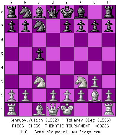 Last move : 1-0 2020 July 24 6:45:5 [Event "FICGS__CHESS__THEMATIC_TOURNAMENT__000236"] [Site "FICGS"] [Date "2020.06.13"] [Round "1"] [White "Kehayov,Yulian"] [Black "Tokarev,Oleg"] [Result "1-0"] [WhiteElo "1332"] [BlackElo "1536"] 1.c4 Nf6 2.Nc3 c5 3.g3 d5 4.cxd5 Nxd5 5.Bg2 Nc7 6.Nf3 1-0 This chess game has been lost on time (started : 2020.06.13 23:17:53) English Opening Player White won this chess game. Follow this game move after move (download)If Chess is a science, it's a most inexact one. If Chess is an art, it is too exacting to be seen as one. If Chess is a sport, it's too esoteric. If Chess is a game, it's too demanding to be just a game. If Chess is a mistress, she's a demanding one. If Chess is a passion, it's a rewarding one. If Chess is life, it's a sad one. (Unknown) Es gibt zwei Arten von Opfern: Korrekte und meine. (Mikhail Nekhemyevich Tal) Los Peones son el alma de una partida de Ajedrez. (Francois Andre Danican Philidor) On est toujours la mazette de quelqu'un d'autre. (Anonyme) For a mechanic, you seem to do an excessive amount of thinking. (C-3PO in Star Wars ep.2)