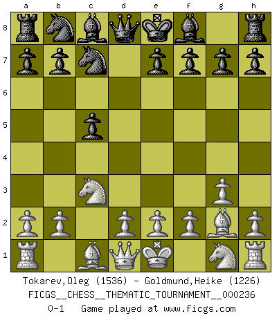 Last move : 0-1 2020 July 24 6:45:5 [Event "FICGS__CHESS__THEMATIC_TOURNAMENT__000236"] [Site "FICGS"] [Date "2020.06.13"] [Round "1"] [White "Tokarev,Oleg"] [Black "Goldmund,Heike"] [Result "0-1"] [WhiteElo "1536"] [BlackElo "1226"] 1.c4 Nf6 2.Nc3 c5 3.g3 d5 4.cxd5 Nxd5 5.Bg2 Nc7 0-1 This chess game has been lost on time (started : 2020.06.13 23:17:53) English Opening Player Black won this chess game. Follow this game move after move (download)One bad move nullifies forty good ones. (Horowitz) Nicht daß Diemer aus Opportunismus Mitglied der NSDAP geworden wäre. Er war ein Fanatiker, in allem, was er tat. (Hans Ree) En la vida, como en el Ajedrez, los Peones propios obstruyen nuestro camino. La gran fortuna de un hombre, su comodidad, placer, hijos, libros, que deberían ayudarle a ganar, con mucha frecuencia lo ponen en Jaque Mate. (Charles Buxton) Les échecs, c'est la lutte contre l'erreur. (Johannes Zukertort) It is not enough to be a good player... you must also play well. (Siegbert Tarrasch)
