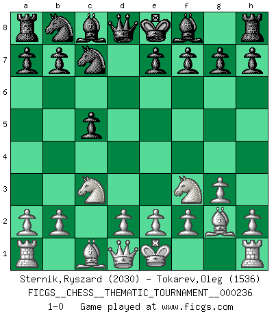 Last move : 1-0 2020 July 24 21:3:24 [Event "FICGS__CHESS__THEMATIC_TOURNAMENT__000236"] [Site "FICGS"] [Date "2020.06.13"] [Round "1"] [White "Sternik,Ryszard"] [Black "Tokarev,Oleg"] [Result "1-0"] [WhiteElo "2030"] [BlackElo "1536"] 1.c4 Nf6 2.Nc3 c5 3.g3 d5 4.cxd5 Nxd5 5.Bg2 Nc7 6.Nf3 1-0 This chess game has been lost on time (started : 2020.06.13 23:17:53) English Opening Player White won this chess game. Follow this game move after move (download)Do you realize Fischer almost never has any bad pieces? He exchanges them, and the bad pieces remain with his opponents. (Yuri Balashov) Die Elozahlen sind sehr schlecht für das Schach. Jetzt ist Schach eine Sportindustrie, die darauf zielt Elopunkte zu machen. (Miguel Najdorf) En la perfecta combinación de Ajedrez como en una historia corta de primera clase, toda la trama y contra trama deberá conducir hacia un final sorprendente, el interes no es mitigado hasta el último momento. (Yates and Winter) Toutes choses étant égales, c'est la conviction qui gagne. Alliée à une volonté de vaincre, elle sert de détonateur, suscite des idées, disperse les doutes et aide à penser clairement. (Robert Fischer) In my experience, there's no such thing as luck. (Obi-Wan Kenobi in Star Wars ep.4)