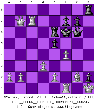 Last move : 1-0 2020 October 31 8:1:19 [Event "FICGS__CHESS__THEMATIC_TOURNAMENT__000236"] [Site "FICGS"] [Date "2020.06.13"] [Round "1"] [White "Sternik,Ryszard"] [Black "Schuett,Wilhelm"] [Result "1-0"] [WhiteElo "2030"] [BlackElo "1800"] 1.c4 Nf6 2.Nc3 c5 3.g3 d5 4.cxd5 Nxd5 5.Bg2 Nc7 6.Nf3 Nc6 7.d3 e5 8.O-O Bd7 9.Nd2 h5 10.Nc4 h4 11.Be3 Qf6 12.Ne4 Qg6 13.Nxc5 hxg3 14.Nxd7 gxh2+ 15.Kh1 Kxd7 16.Rc1 Re8 17.Qb3 Kc8 18.Bxa7 Re6 19.Nb6+ Kd8 20.Na8 Nxa8 21.Qxb7 Nc7 22.Bb6 Bd6 23.Rxc6 Ke7 24.Bxc7 Bxc7 25.Rxc7+ Kf6 26.f4 1-0 English Opening Kingside Castling by player White (move 8) Player White won this chess game. Follow this game move after move (download)The hardest game to win is a won game. (Emanuel Lasker) Ich bin es gewohnt, das die Jugend mir überhaupt keinen Respekt entgegenbringt. (Alexander Morozewich) EL Ajedrez es como la vida. (Boris Spassky) Même si vous avez un bon coup à faire, regardez toujours s'il n'y en a pas un qui lui soit préférable. (Pedro Damiano) For peace of mind, resign as general manager of the universe. (Douglas Adams)