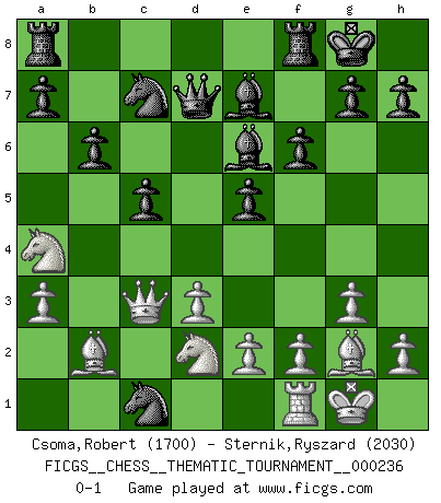 Last move : 0-1 2020 July 12 17:26:52 [Event "FICGS__CHESS__THEMATIC_TOURNAMENT__000236"] [Site "FICGS"] [Date "2020.06.13"] [Round "1"] [White "Csoma,Robert"] [Black "Sternik,Ryszard"] [Result "0-1"] [WhiteElo "1700"] [BlackElo "2030"] 1.c4 Nf6 2.Nc3 c5 3.g3 d5 4.cxd5 Nxd5 5.Bg2 Nc7 6.Nf3 Nc6 7.O-O e5 8.d3 Be7 9.b3 Be6 10.Bb2 O-O 11.Rc1 f6 12.Na4 b6 13.a3 Qd7 14.Qd2 Na5 15.Qc3 Nxb3 16.Nd2 Nxc1 0-1 English Opening Kingside Castling by player White (move 7) Kingside Castling by player Black (move 10) Player Black won this chess game. Follow this game move after move (download)The passed pawn is a criminal, who should be kept under lock and key. Mild measures, such as police surveillance, are not sufficient. (Nimzovitch) Offensichtlich kennt Kasparow nichts anderes als Schach, und ich könnte 500 weitere Spieler dieser Sorte benennen. (Judith Polgar) Cuando no sepas que mover, espera por una idea que se le venga a la la cabeza de tu oponente. Tenlo por seguro de que esa idea estará incorrecta. (Siegbert Tarrasch) Mon pion favori sur ma case favorite ! Bronstein en parlant d'un coup de pion en h5 quand il avait les Noirs. To send light into the darkness of men's hearts - such is the duty of the artist. (Schumann)