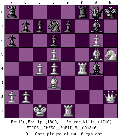 Last move : 1-0 2020 July 18 0:54:2 [Event "FICGS__CHESS__RAPID_B__000346"] [Site "FICGS"] [Date "2020.06.14"] [Round "1"] [White "Reilly,Philip"] [Black "Pelzer,Willi"] [Result "1-0"] [WhiteElo "1800"] [BlackElo "1700"] 1.d4 Nf6 2.c4 g6 3.Nc3 Bg7 4.e4 d6 5.f3 O-O 6.Bg5 Nc6 7.Nge2 a6 8.Qd2 Qe8 9.Nd5 Nxd5 10.exd5 Nb8 11.O-O-O Nd7 12.Nc3 f5 13.h4 Nf6 14.Re1 Qf7 15.Bd3 Re8 16.g4 fxg4 17.fxg4 Bxg4 18.Rhf1 Rf8 19.Qg2 Bh5 20.Ne4 h6 21.Ng3 Bg4 22.Qc2 Kh7 23.h5 Kh8 24.hxg6 Qg8 25.Qh2 h5 26.Rf4 Nd7 27.Nxh5 1-0 King's Indian : Saemisch, 5...O-O Kingside Castling by player Black (move 5) Queenside Castling by player White (move 11) Player White won this chess game. Follow this game move after move (download)A thorough understanding of the typical mating continuations makes the most complicated sacrificial combinations leading up to them not only not difficult, but almost a matter of course. (Siegbert Tarrasch) Fallen sollten polizeilich verboten werden. (Savielly Grigorievitsch Tartakower) Las Aperturas te enseñan aperturas. ¡Los Finales te enseñan Ajedrez!. (Stephan Gerzadowicz) Le thème de l'attaque double intervient d'une manière ou d'une autre dans l'immense majorité des combinaisons. (Youri Averbakh) Somewhere in the world there is an epigram for every dilemma. (Hendrik Willem van Loon)