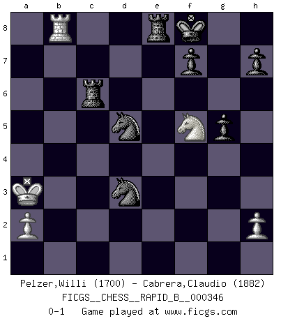 Last move : 0-1 2020 July 21 10:9:49 [Event "FICGS__CHESS__RAPID_B__000346"] [Site "FICGS"] [Date "2020.06.14"] [Round "1"] [White "Pelzer,Willi"] [Black "Cabrera,Claudio"] [Result "0-1"] [WhiteElo "1700"] [BlackElo "1882"] 1.d4 d5 2.c4 dxc4 3.e4 Nf6 4.Nc3 e5 5.d5 c6 6.Bxc4 b5 7.Bd3 b4 8.Nce2 cxd5 9.Bb5+ Bd7 10.Bxd7+ Qxd7 11.Nf3 dxe4 12.Nxe5 Qxd1+ 13.Kxd1 Bc5 14.Be3 Bxe3 15.fxe3 Nbd7 16.Nc6 Nc5 17.Nf4 g5 18.Rc1 Na4 19.Ne2 Nxb2+ 20.Kc2 Nc4 21.Kb3 Nxe3 22.Kxb4 Nxg2 23.Rc5 Rg8 24.Rd1 Rg6 25.Ned4 Nf4 26.Re5+ Kf8 27.Ra5 N6d5+ 28.Ka3 Re8 29.Re1 e3 30.Rxa7 e2 31.Rb7 Nd3 32.Rxe2 Rxe2 33.Nf5 Rxc6 34.Rb8+ Re8 0-1 QGA : 3.e4 Player Black won this chess game. Follow this game move after move (download)You know, comrade Pachman, I don't enjoy being a Minister, I would rather play Chess like you. (Che Guevara) Ich habe die Schachforschung dermaßen betrieben, dass sie auf eine wissenschaftliche Basis gestellt wurde. (Mikhail Moiseyevich Botvinik) Cuando me preguntan: -¿Cual es el secreto que te hace hacer mejores movidas que tus oponentes?, Yo respondo: Me da gusto que me pregunten eso, porque, como veran, hay una simple razón. Yo pienso mis propias movidas y dejo a mi oponente que el piense las suyas. (Alexander Alekhine) La solitude du joueur d'Echecs à l'approche du mat est semblable à celle du condamné. (Francis Szpiner) O divine art of subtlety and secrecy! Through you we learn to be invisible, through you inaudible and hence we can hold the enemy's fate in our hands. (Sun Tzu)