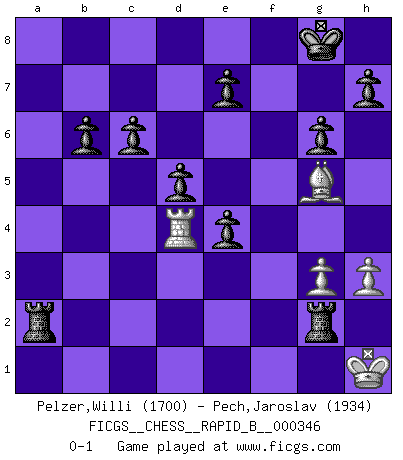 Last move : 0-1 2020 August 8 22:42:20 [Event "FICGS__CHESS__RAPID_B__000346"] [Site "FICGS"] [Date "2020.06.14"] [Round "1"] [White "Pelzer,Willi"] [Black "Pech,Jaroslav"] [Result "0-1"] [WhiteElo "1700"] [BlackElo "1934"] 1.e4 c5 2.Nf3 Nc6 3.g3 g6 4.d4 cxd4 5.Nxd4 Bg7 6.Nxc6 bxc6 7.Nc3 Nf6 8.Bg2 Ba6 9.Ne2 O-O 10.O-O Qb6 11.Re1 Ng4 12.Rf1 f5 13.h3 Nxf2 14.Rxf2 fxe4 15.Qe1 Bxe2 16.Qxe2 Rxf2 17.Qc4+ d5 18.Qb3 Rxc2 19.Qxb6 axb6 20.Bg5 Bd4+ 21.Kh1 Rxb2 22.Rd1 R8xa2 23.Rxd4 Rxg2 0-1 Sicilian defense Kingside Castling by player Black (move 9) Kingside Castling by player White (move 10) Player Black won this chess game. Follow this game move after move (download)I believe that Chess possesses a magic that is also a help in advanced age. A rheumatic knee is forgotten during a game of Chess and other events can seem quite unimportant in comparison with a catastrophe on the chessboard. (Vlastimil Hort) Je mehr wir mit Computern analysieren, desto mehr glauben wir an Verteidigung. (Vladimir Kramnik) Personalmente, yo prefiero mirar hacia el futuro en donde un programa de computadora gane el título mundial de Ajedrez. La humanidad necesita una lección de humildad. (Richard Dawkings) Les Echecs sont et restent toujours un combat, un combat intégral comme la boxe, la lutte ou un autre sport, et où il doit y avoir un vainqueur et un vaincu. (Joseph Emil Diemer) The obstacle is the path. (Zen proverb)
