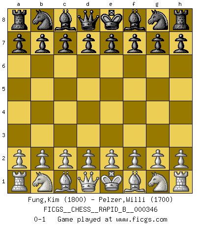 Last move : 0-1 2020 July 14 21:16:3 [Event "FICGS__CHESS__RAPID_B__000346"] [Site "FICGS"] [Date "2020.06.14"] [Round "1"] [White "Fung,Kim"] [Black "Pelzer,Willi"] [Result "0-1"] [WhiteElo "1800"] [BlackElo "1700"] 0-1 This chess game has been lost on time (started : 2020.06.14 15:23:15) Player Black won this chess game. Follow this game move after move (download)Fischer is completely natural. He plays no roles. He's like a child. Very, very simple. (Zita Rajcsanyi) Man braucht nicht immer den besten Zug zu spielen: Ein Zug muß aktiv, unternehmungslustig, korrekt und schön sein. (David Bronstein) El Ajedrez lo es todo: arte, ciencia y deporte. (Anatoly Karpov) Les échecs, c'est l'art d'analyser. (Mikhail Botvinnik) As the days dwindle down... to a precious few. (Maxwell Anderson)