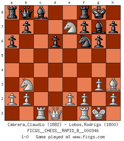 Last move : 1-0 2020 June 27 8:10:23 [Event "FICGS__CHESS__RAPID_B__000346"] [Site "FICGS"] [Date "2020.06.14"] [Round "1"] [White "Cabrera,Claudio"] [Black "Lobos,Rodrigo"] [Result "1-0"] [WhiteElo "1882"] [BlackElo "1800"] 1.c4 c5 2.Nf3 Nf6 3.Nc3 g6 4.g3 Bg7 5.d4 cxd4 6.Nxd4 O-O 7.Bg2 Nc6 8.O-O a6 9.c5 Qc7 10.Nb3 Rd8 11.Bf4 Ne5 12.Rc1 d6 13.cxd6 exd6 14.Bg5 Qb8 15.Nd5 Ned7 16.Bh3 Rf8 17.Bxf6 Nxf6 18.Ne7+ 1-0 English : Symmetrical variation Kingside Castling by player Black (move 6) Kingside Castling by player White (move 8) Player White won this chess game. Follow this game move after move (download)Life is a kind of Chess, with struggle, competition, good and ill events. (Benjamin Franklin) Man gibt nur Pakete auf. (Paul Keres) Una buena ofensiva y una buena defensa, comienzan ambas con un buen desarrollo. (Bruce A. Moon) Les Echecs, c'est l'art de la guerre sans les charniers, c'est la résurrection des morts tombés au champ d'honneur, l'espoir perpétuel, la suprématie de l'intelligence sur la force, la culture de l'esprit. (F. Szpiner) They say poker is a zero-sum game. It must be, because every time I play my sum ends up zero. (Max Shapiro)